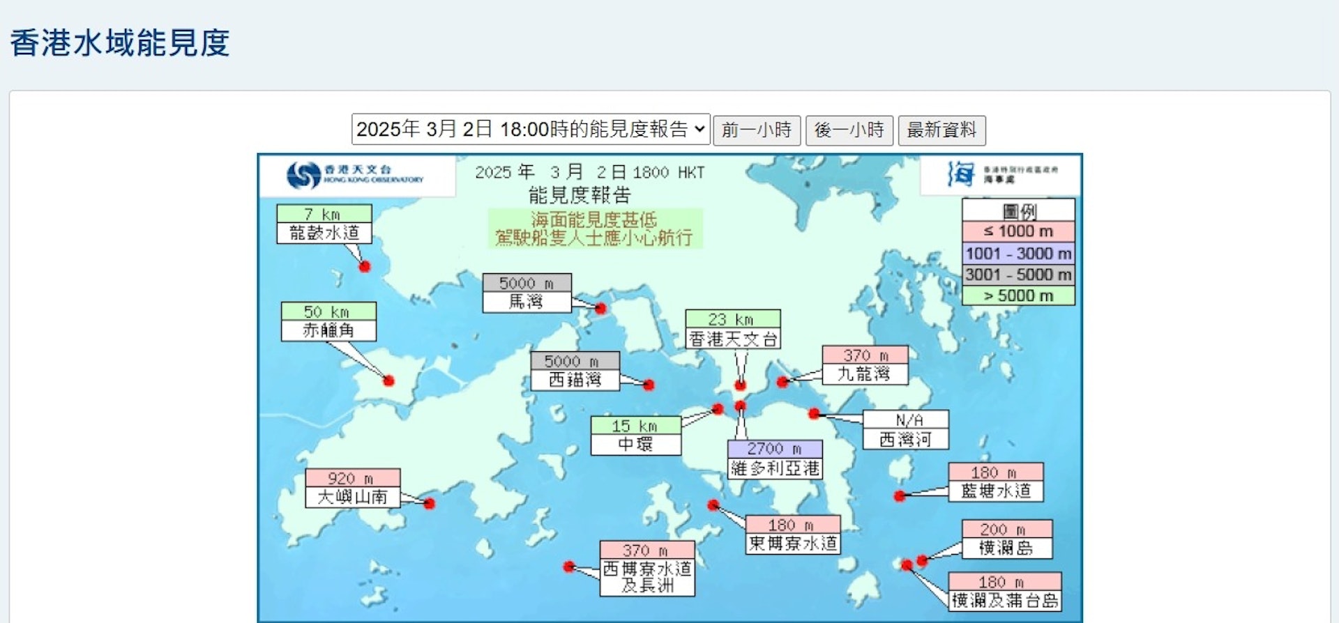 3月2日21:00香港水域能見度,天文台降至500米。(天文台圖片)