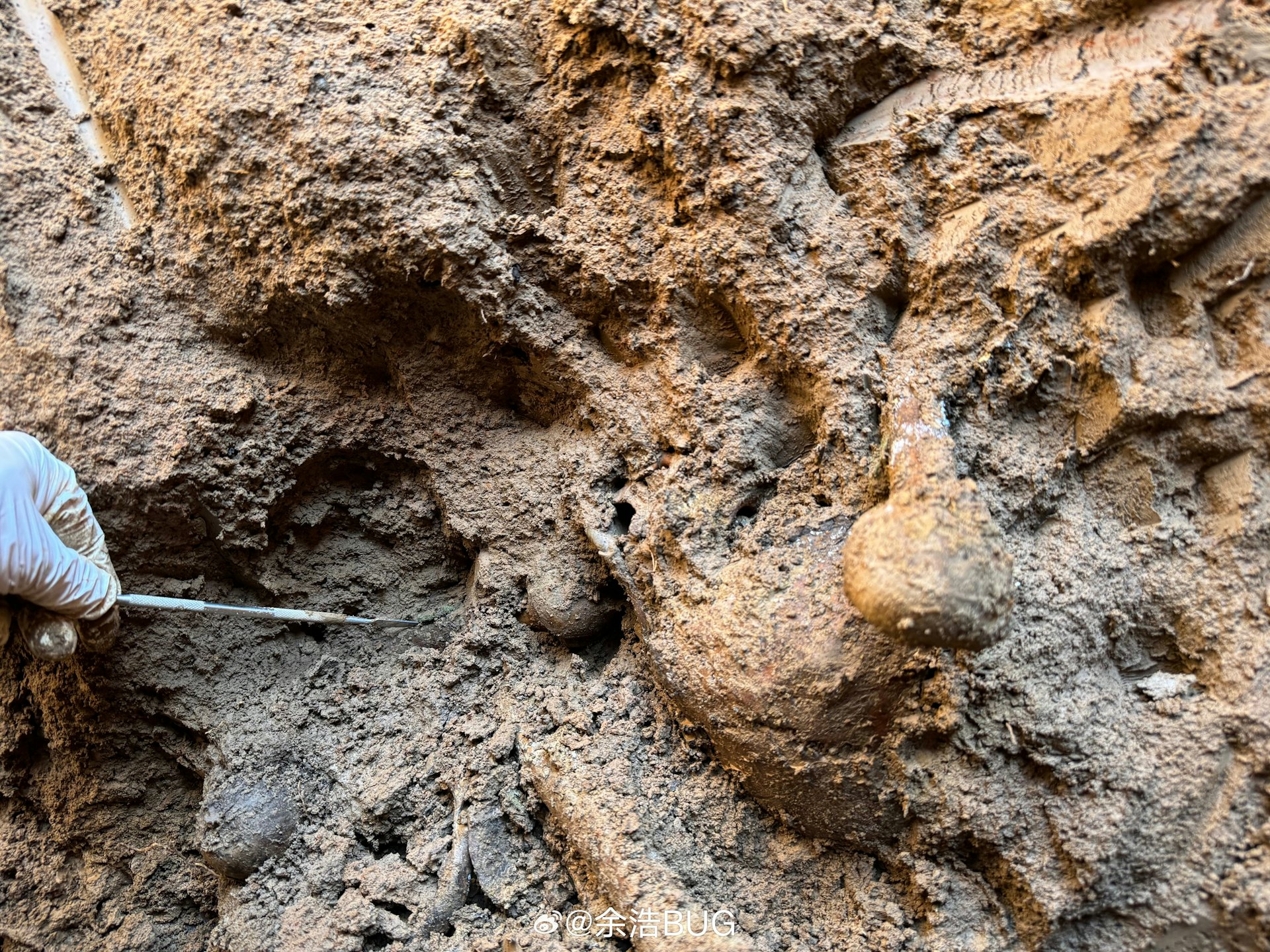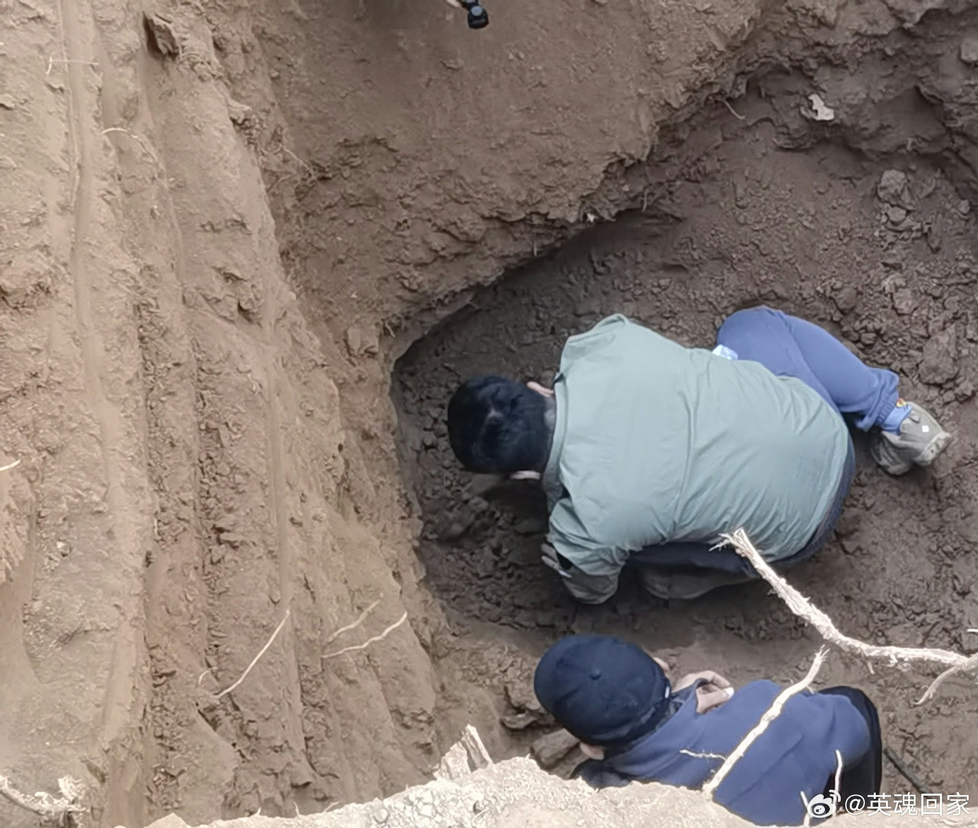 % ?5 F$ G+ i0 k& {1 b7 K4 K公仔箱論壇工作人員清理表層覆土及發掘,陸續收殮出多具將士骸骨。(微博@英魂回家)
