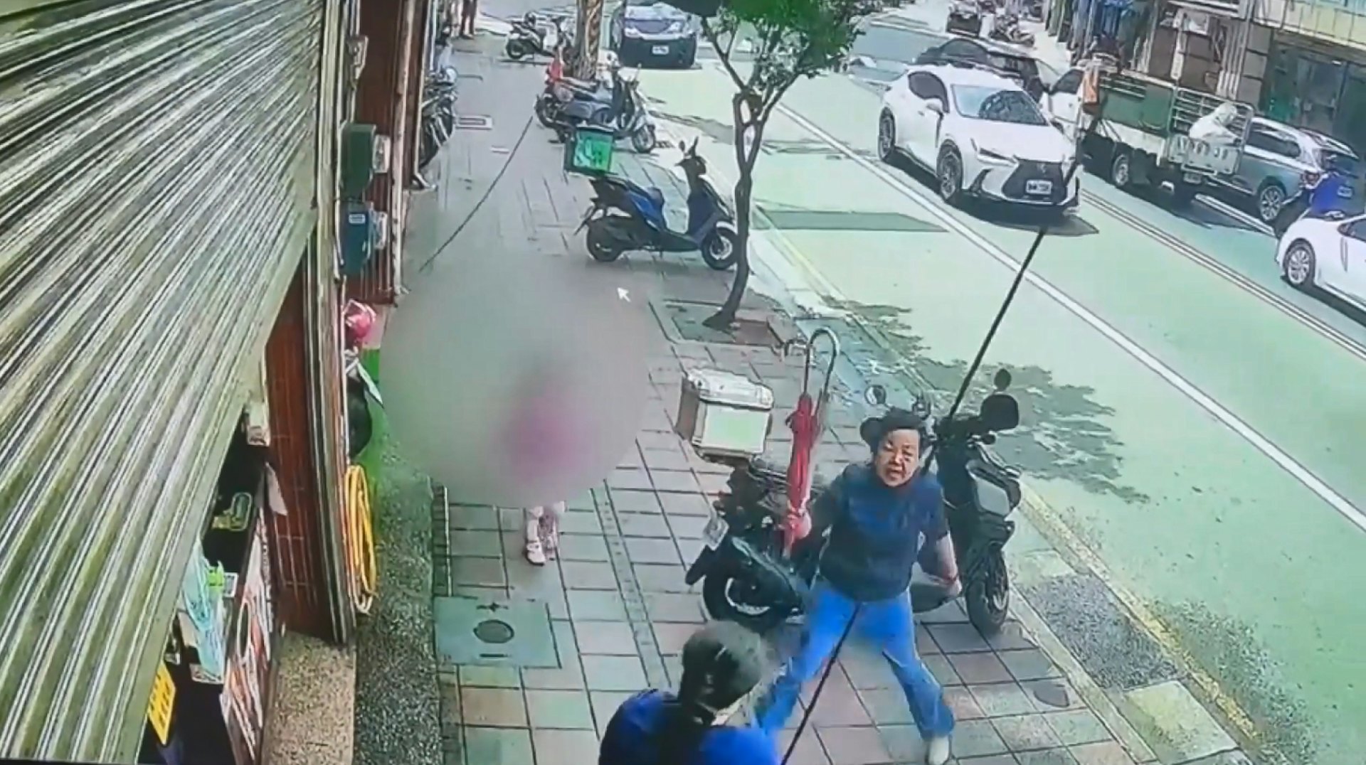 台灣一名年約50歲婦人與手搖飲店店員爭執,突掏刀攻擊在場人士,終刺中一名勸阻女子3歲女兒背部,過程被監視器全錄下。(聯合新聞網影片截圖)