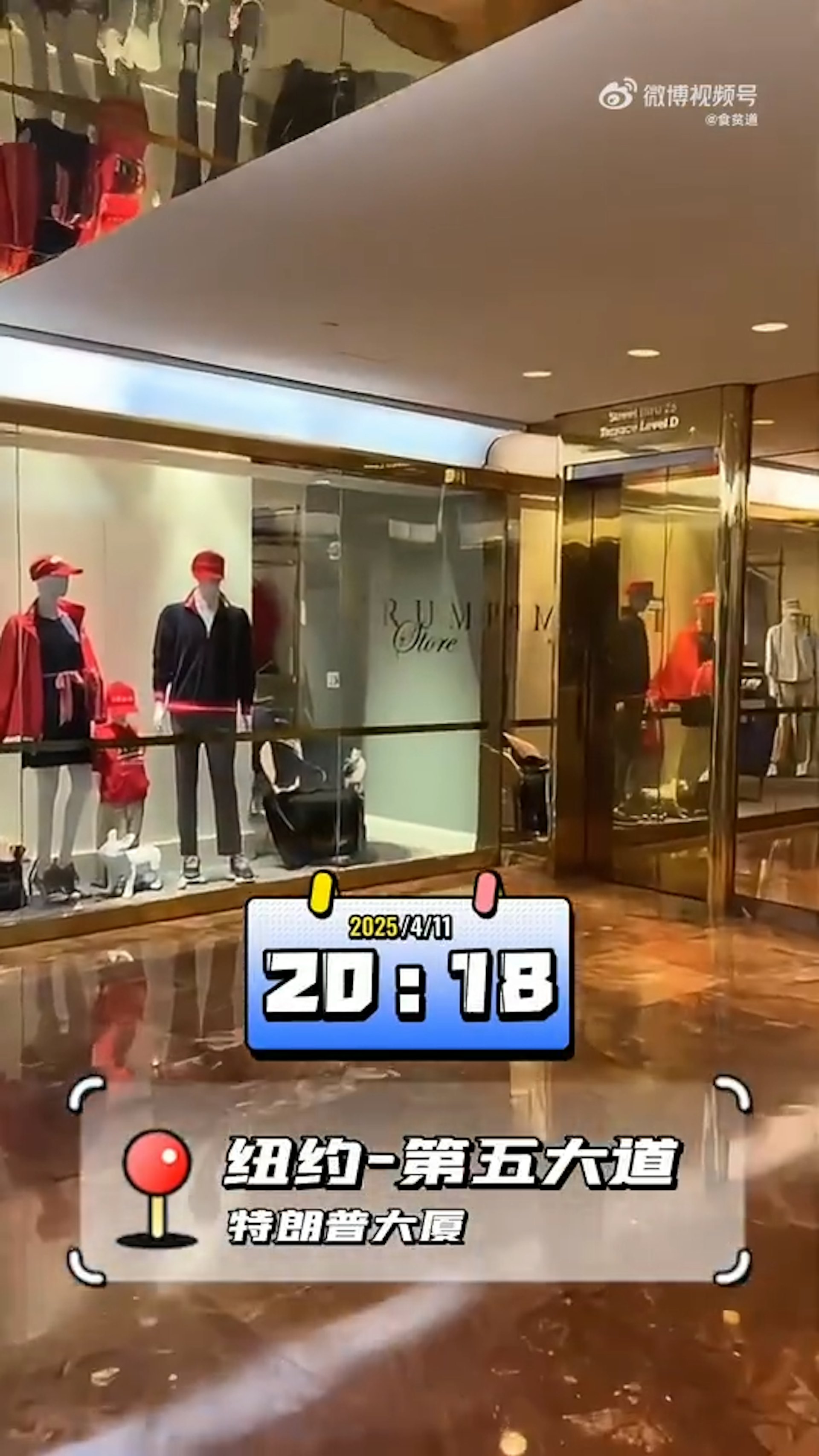 在紐約第五大道的特朗普大廈裏面的紀念品店發現商品的「中國製造」標籤似乎都被遮住了(微博@央視新聞影片截圖)