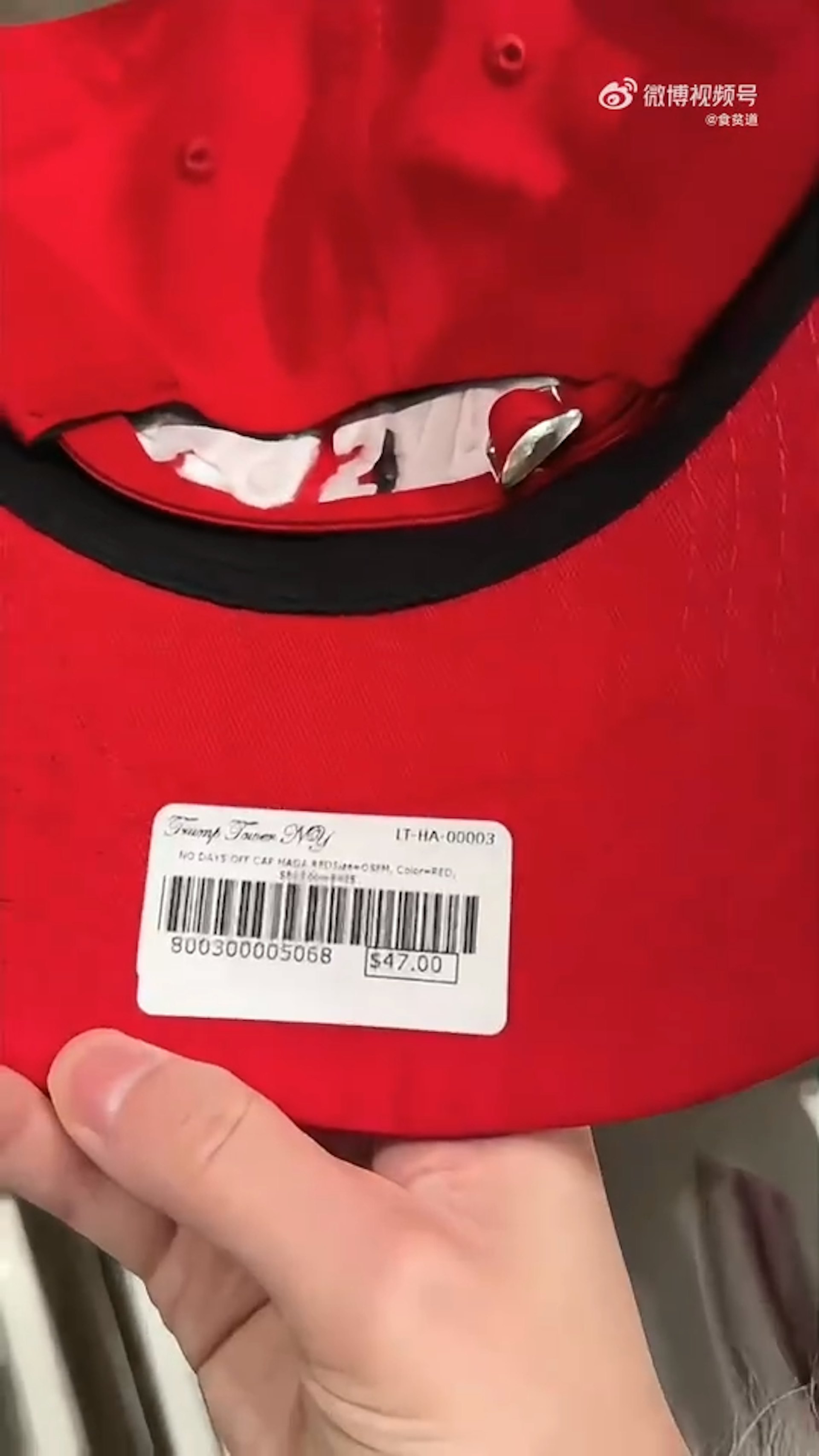 內地女網友在紀念品店查看帽子、杯子、衣服和川普公仔的標籤,發現製造地訊息都「剛好」被標籤貼紙覆蓋,疑似刻意遮住「中國製造」(微博@食貧道影片截圖)