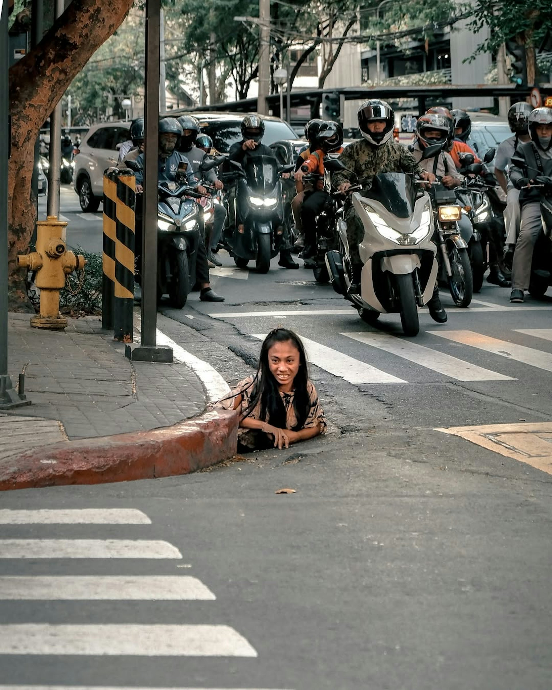 一名攝影師在菲律賓馬尼拉散步回家期間發現一名女子從下水道爬出來,這一幕簡直就像一部恐怖電影裏的場景。(Instagram@iammrthirty)