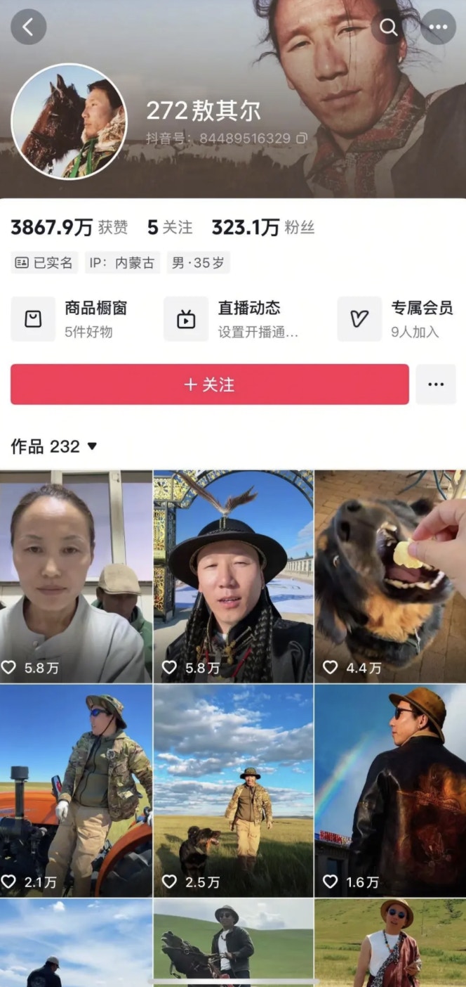 敖其爾全名烏力吉敖其爾,他平時主要發一些與內蒙古當地草原生活有關的短片,累積了超過300萬的粉絲。9月20日上午,他還曾發布一條短視頻內容,介紹其經營的「敖其爾驛站」不久前在錫林郭勒開業。4 `9 }4 F4 `3 h1 P; c( a$ E