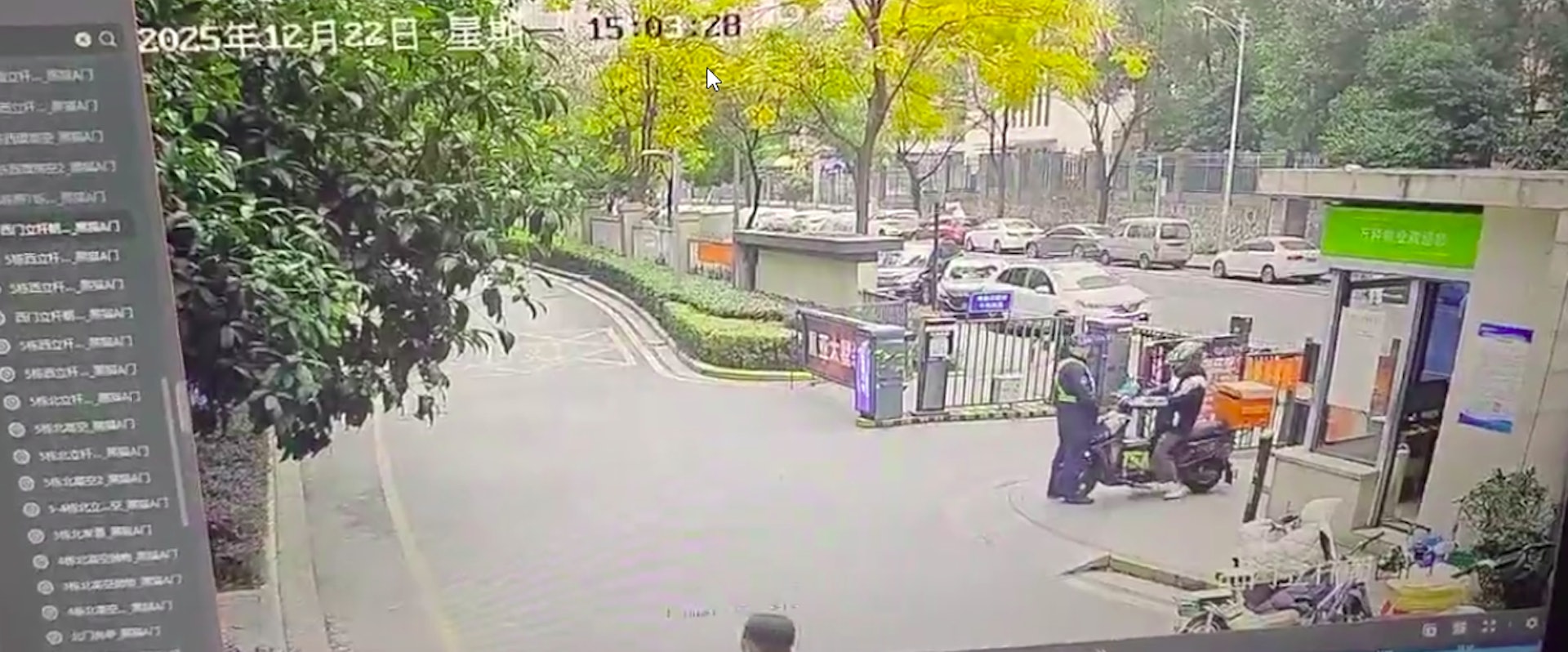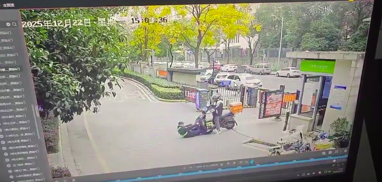 1 ~3 Q/ c' U- U$ R% I) D9 M22日下午,一名淘寶閃購外賣員欲騎車進小區送餐,不料被該小區保安阻攔。(X平台影片截圖)