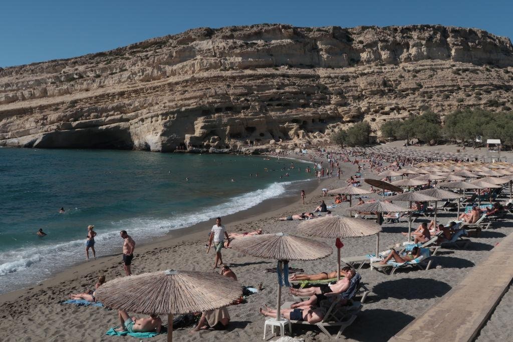 2022年7月20日,希臘克里特島(Crete),遊客在海灘游泳放鬆。(Getty)公仔箱論壇! U6 m% J4 o) i! @! t4 _" _