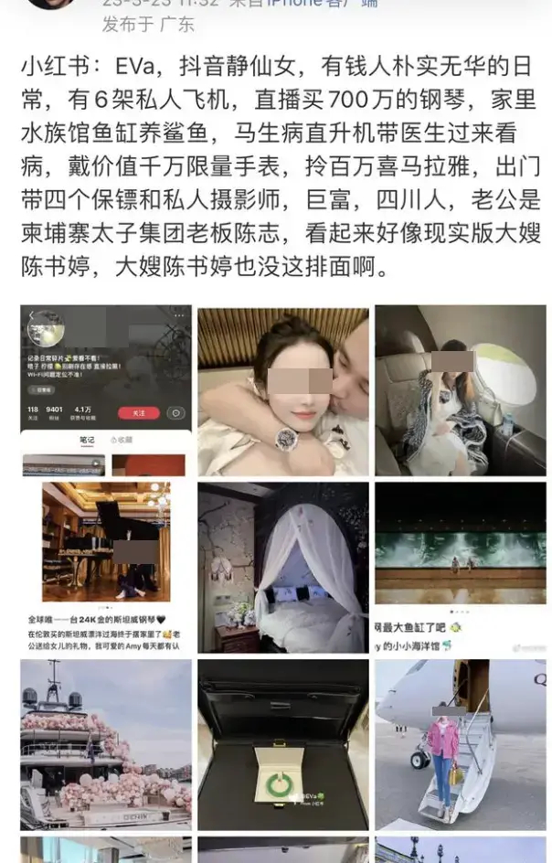 雖然目前無法確認該IP屬柬埔寨女子真的的身份,但其炫富的程度,有內地自媒體在微博整理其社群動態指出,無論生活規格、消費水準或排場,該女子都已超越一般炫富網紅。不過,有網民發現EVa小紅書和抖音帳號都已被清空。 |