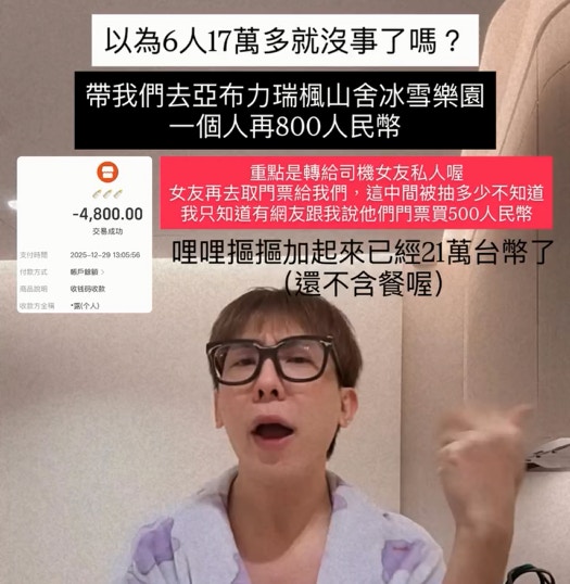 林進在Instagram限時動態連續發文透露,這趟六人行程每人團費高達人民幣6580元,光是團費就花了17萬台幣(約4.2萬港元)打底,後續還得額外支付遊樂園門票與雪服租借費用。然而實際體驗卻與預期天差地遠,原本以為是包車服務,最終卻得搭地鐵、徒步移動,此外,他還指控導遊接送延遲一個半小時,卻一句道歉都沒有。