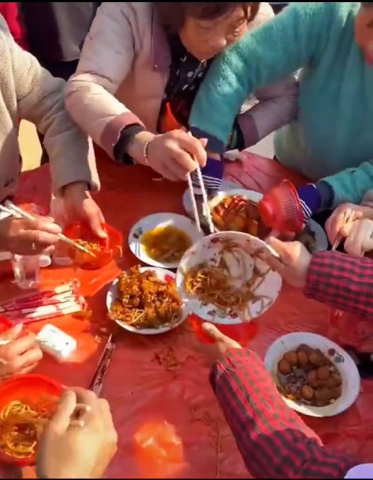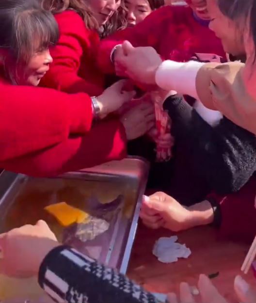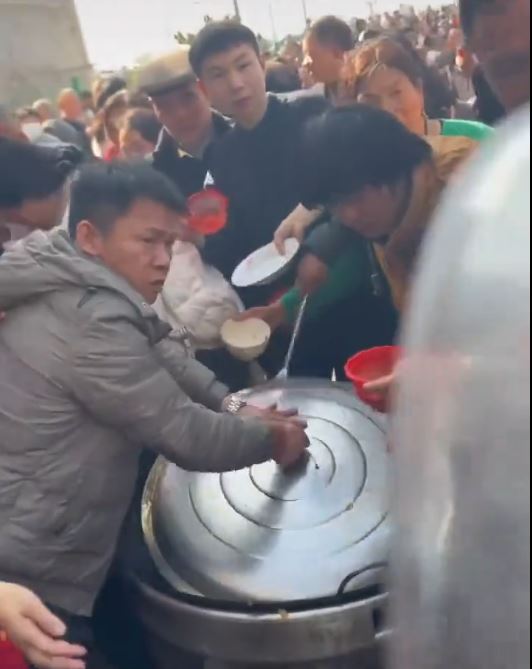 現場視頻顯示,菜還在鍋裡,就有很多人拿着碗湧上前,工作人員只能蓋緊鍋蓋,牢牢護住。工作人員端託盤準備上菜,網友就蜂擁而上,一搶而光。一名粉絲稱,自己當時搶到了一根粉,一半已嗦進嘴,還有一半在外面,硬生生被其他人給拽出去了。 |
