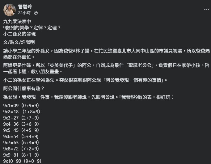 管碧玲於Facebook分享小孫女學數學時發現了乘法表的「9的秘密」。(Facebook/biling.kuan)4 u& j9 B$ E- e1 {% e+ X* j7 c. ]