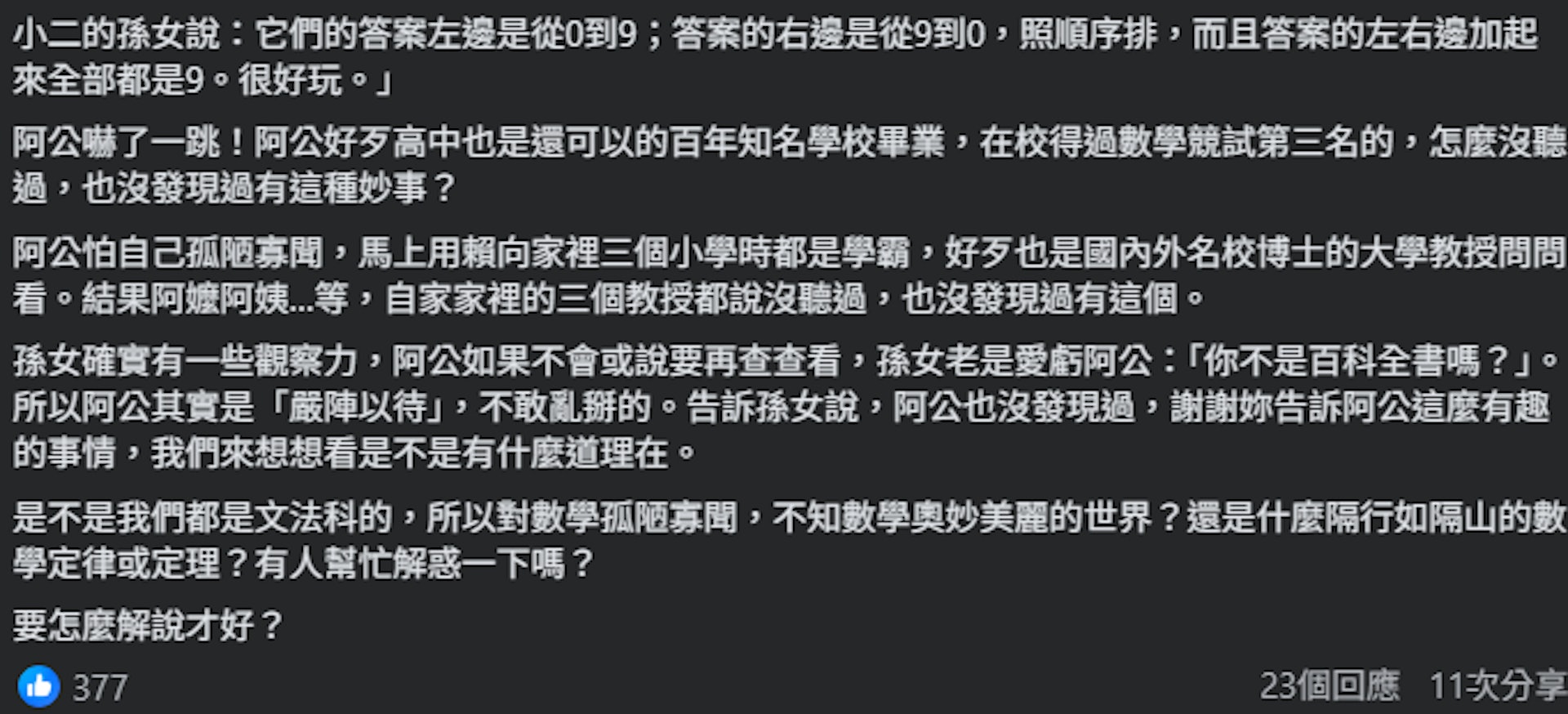 文末她打趣地說可能是自己是文法科,所以對數學孤陋寡聞,不知數學奧妙美麗的世界,貼文引起熱議,不少網友也留言幫忙解答。 |