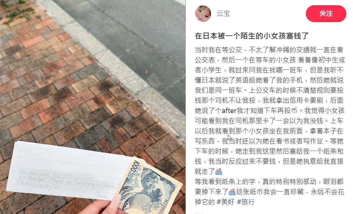 近日,小紅書博主分享了發生在日本沖繩的一輛巴士上的事情,她被陌生的日本小女孩塞錢了……