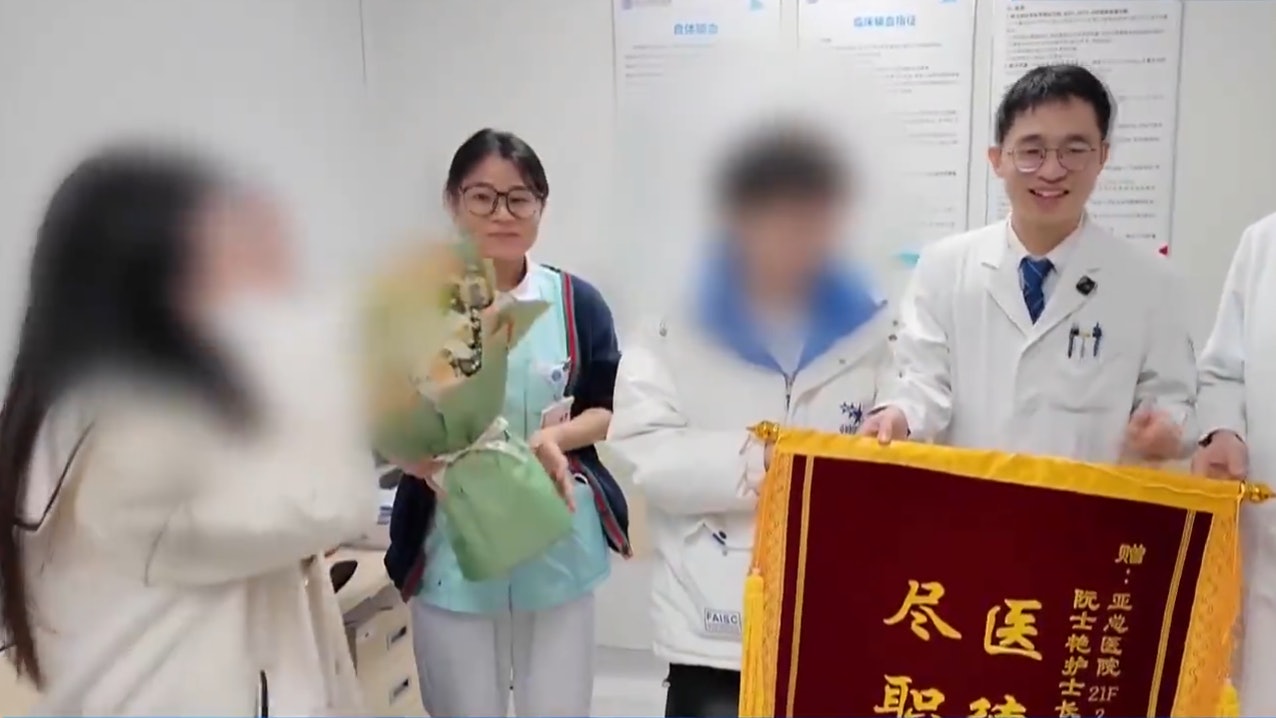 $ a( s% p, N" W: z% J2 D小丁與父母帶着錦旗重返醫院,感謝醫護人員。(影片截圖) |