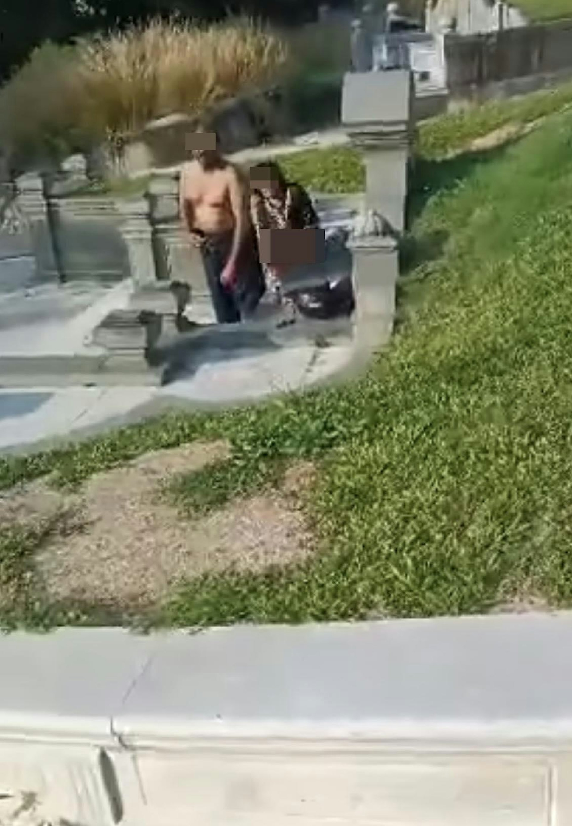 就在2人進行性行為時,1名華裔女子「撞破」,邊攝影片邊怒斥「這裏是人家祭拜的地方!你們還要來這裏弄髒(搞破壞)多少次啊!」、「這裏是先人的地方,你們竟然在這裏做愛啊!」,又說要報警處理,「你們等着!等着!等着!」。男女慌忙穿衣道歉 拍片者堅持報警:說對不起也沒用!