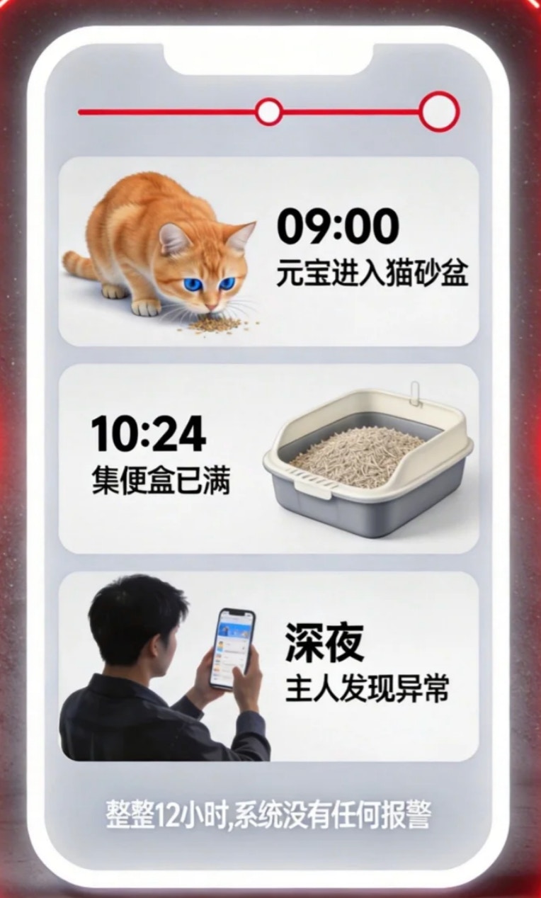 他通過自動貓砂盆的App數據發現,當天上午9時許貓咪進貓砂盆上廁所後,在貓砂盆中停留時長超過1小時未離開。當天上午10點24分左右,數據顯示集便盒已滿,一直到晚上被發現,「『元寶』可能卡在里面接近12小時了。」