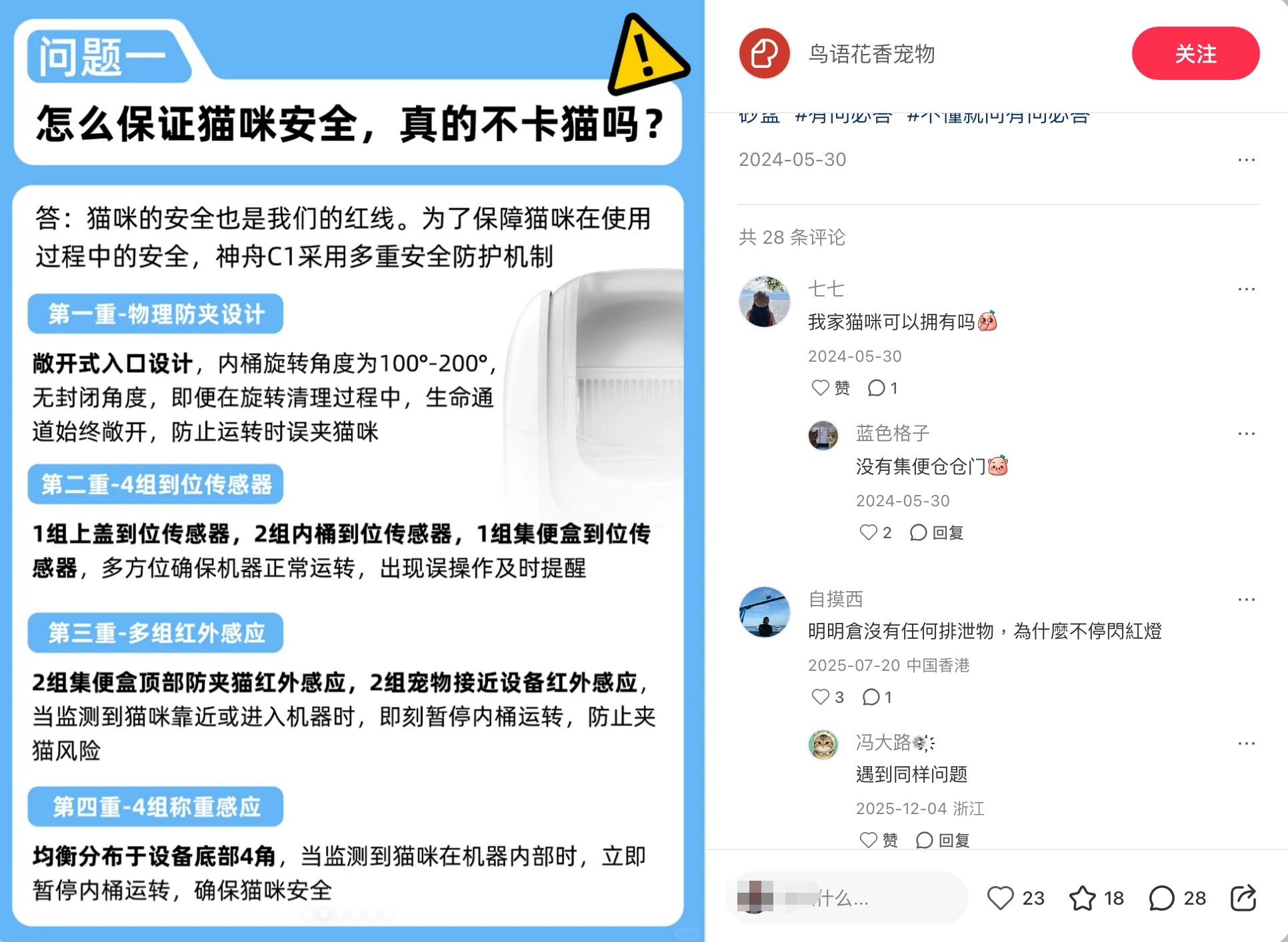 據悉,這款貓砂盆為網店「鳥語花香寵物」的智能貓砂盆產品,名為「神舟C1智能貓砂盆」,機器為開放式大空間設計(70L),特色為9L大容量集便倉,並支持智能App控制。網店官方帳號的介紹中寫道,神舟C1採用多重安全防護機制,敞開式入口即便在旋轉清理過程中也始終敞開,防止運轉時誤夾貓咪。