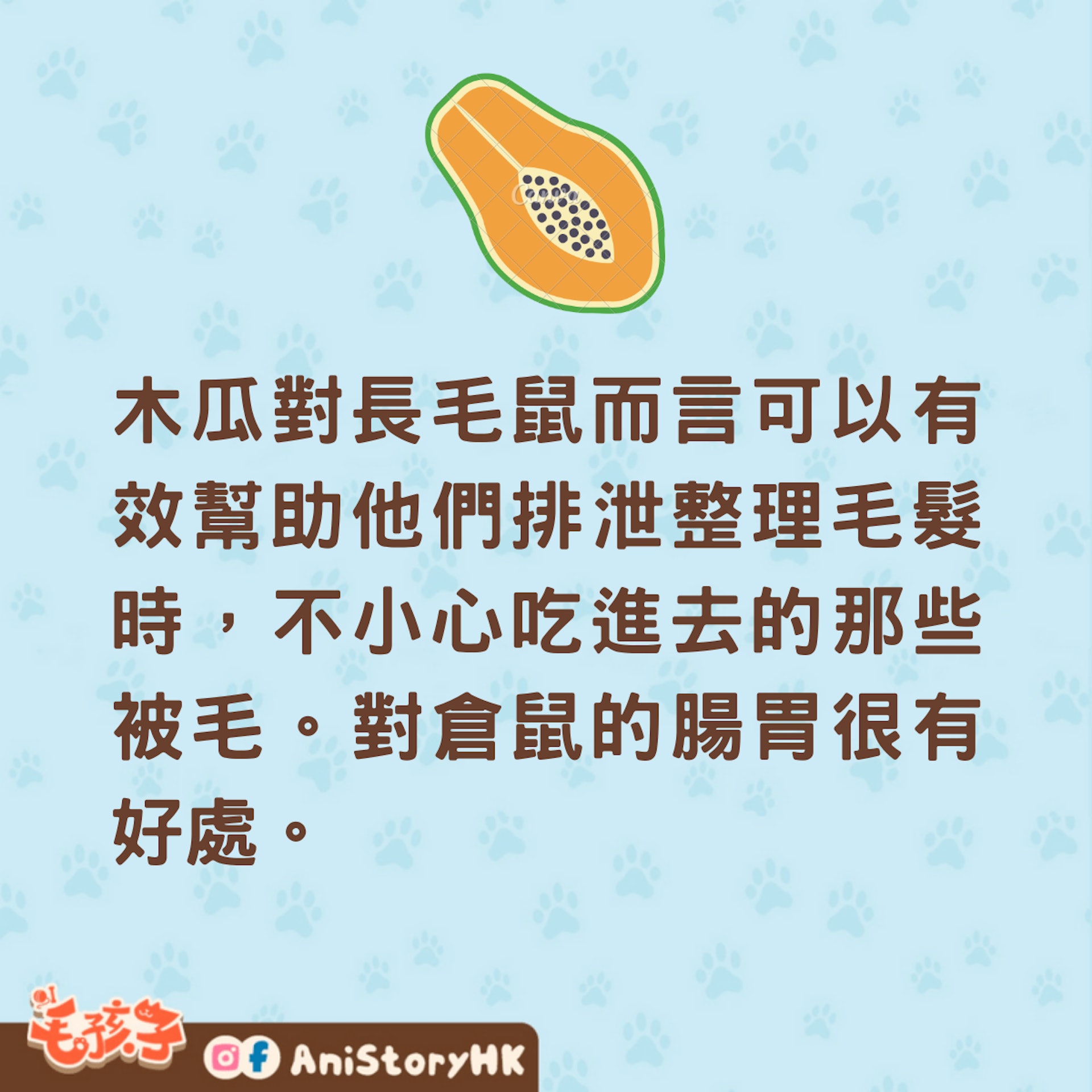 木瓜對長毛鼠而言可以有效幫助他們排泄整理毛髮時,不小心吃進去的那些被毛。對倉鼠的腸胃很有好處。