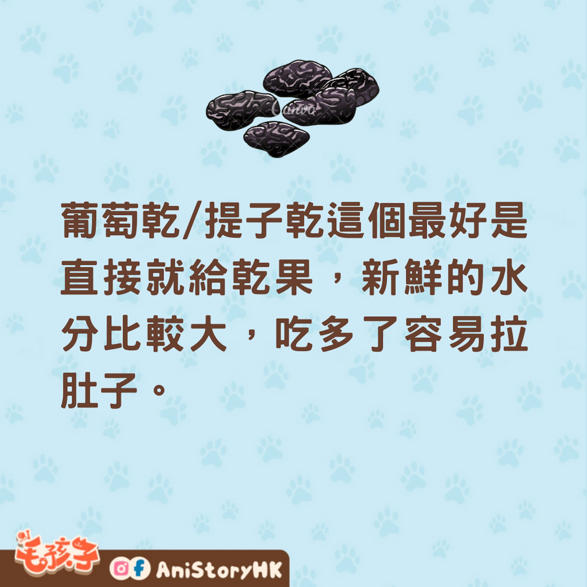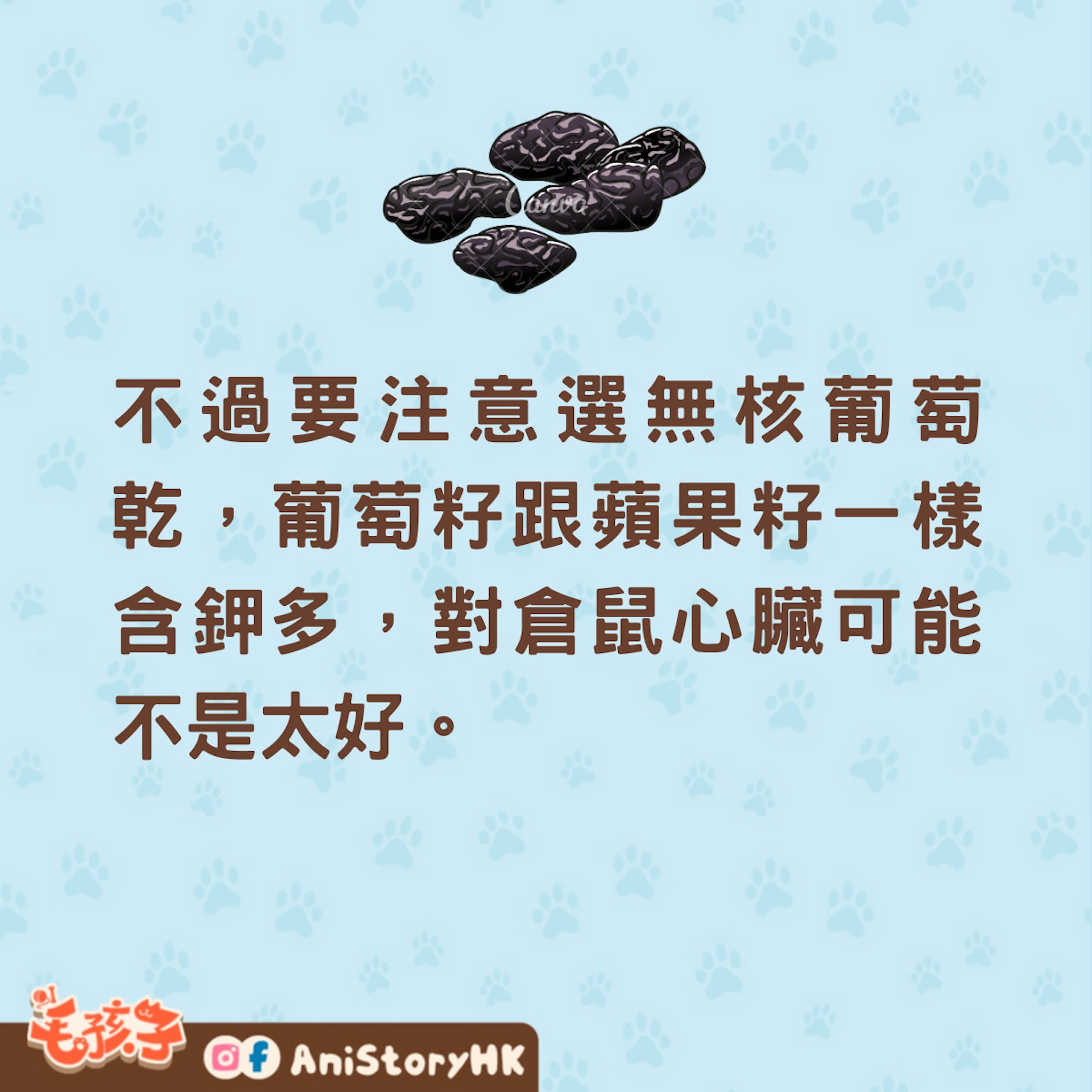 葡萄乾/提子乾這個最好是直接就給乾果,新鮮的水分比較大,吃多了容易拉肚子。不過要注意選無核葡萄乾,葡萄籽跟蘋果籽一樣含鉀多,對倉鼠心臟可能不是太好。