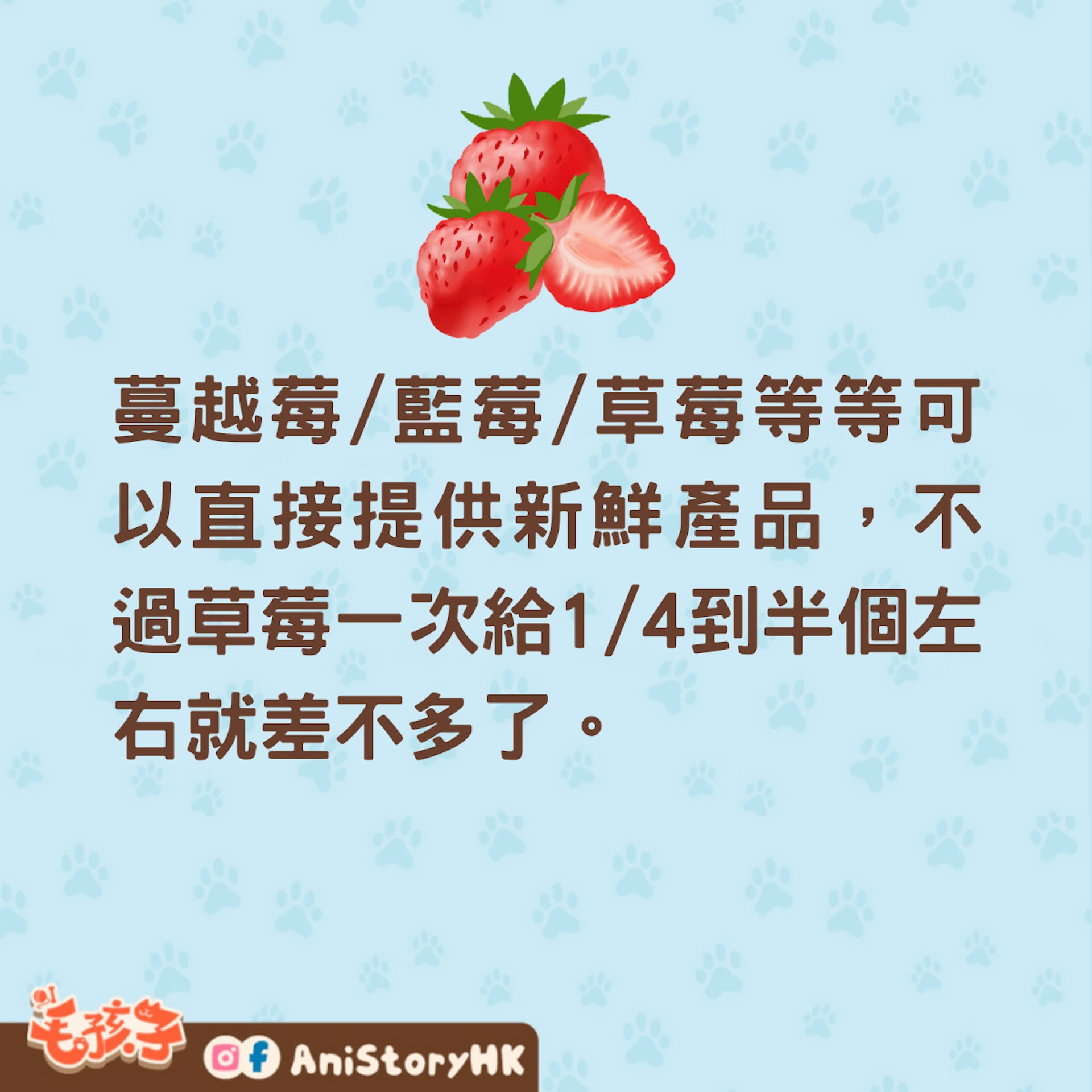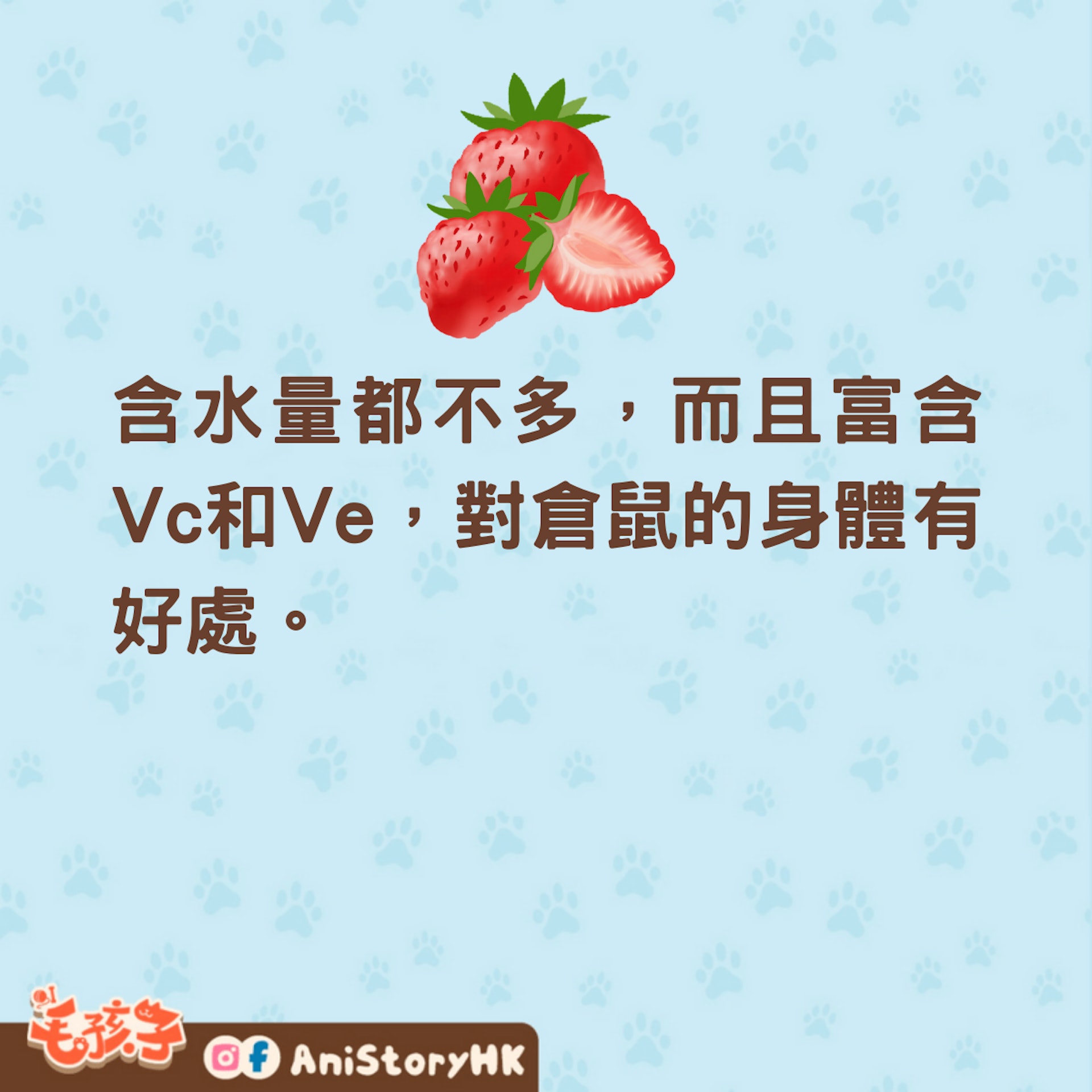 蔓越莓/藍莓/士多啤梨(草莓)等等可以直接提供新鮮產品,不過草莓一次給1/4到半個左右就差不多了。含水量都不多,而且富含Vc和Ve,對倉鼠的身體有好處。