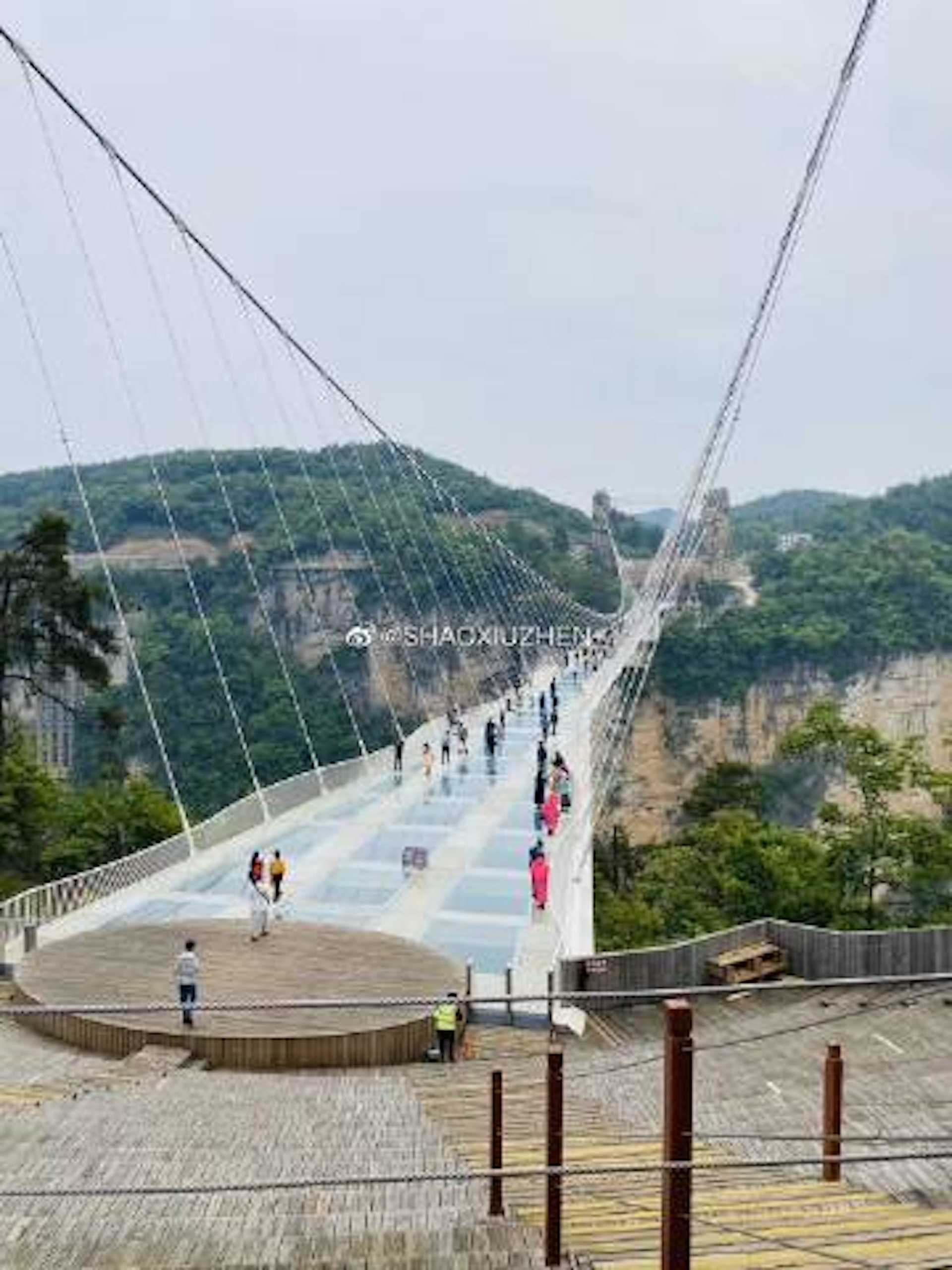 * y0 M( m* e U網民分享張家界的玻璃橋,認為安全防護不夠。(微博)