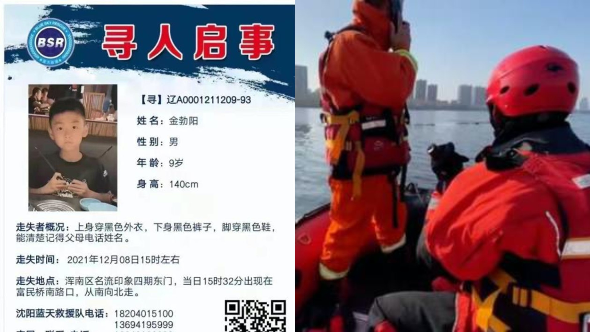 , [6 H, m; N, B近兩日,一則尋人啟事在內地網絡廣為流傳。該尋人啟事寫道,「金勃陽,9歲,身高140cm,走失時上身穿黑色外衣,下身穿黑色褲子,腳穿黑色鞋」。該尋人啟事提到,12月8日15時左右陽陽曾出現於渾南區名流印象四期東門,15時32分出現在富民橋南路口往北走,之後就失去了蹤影。