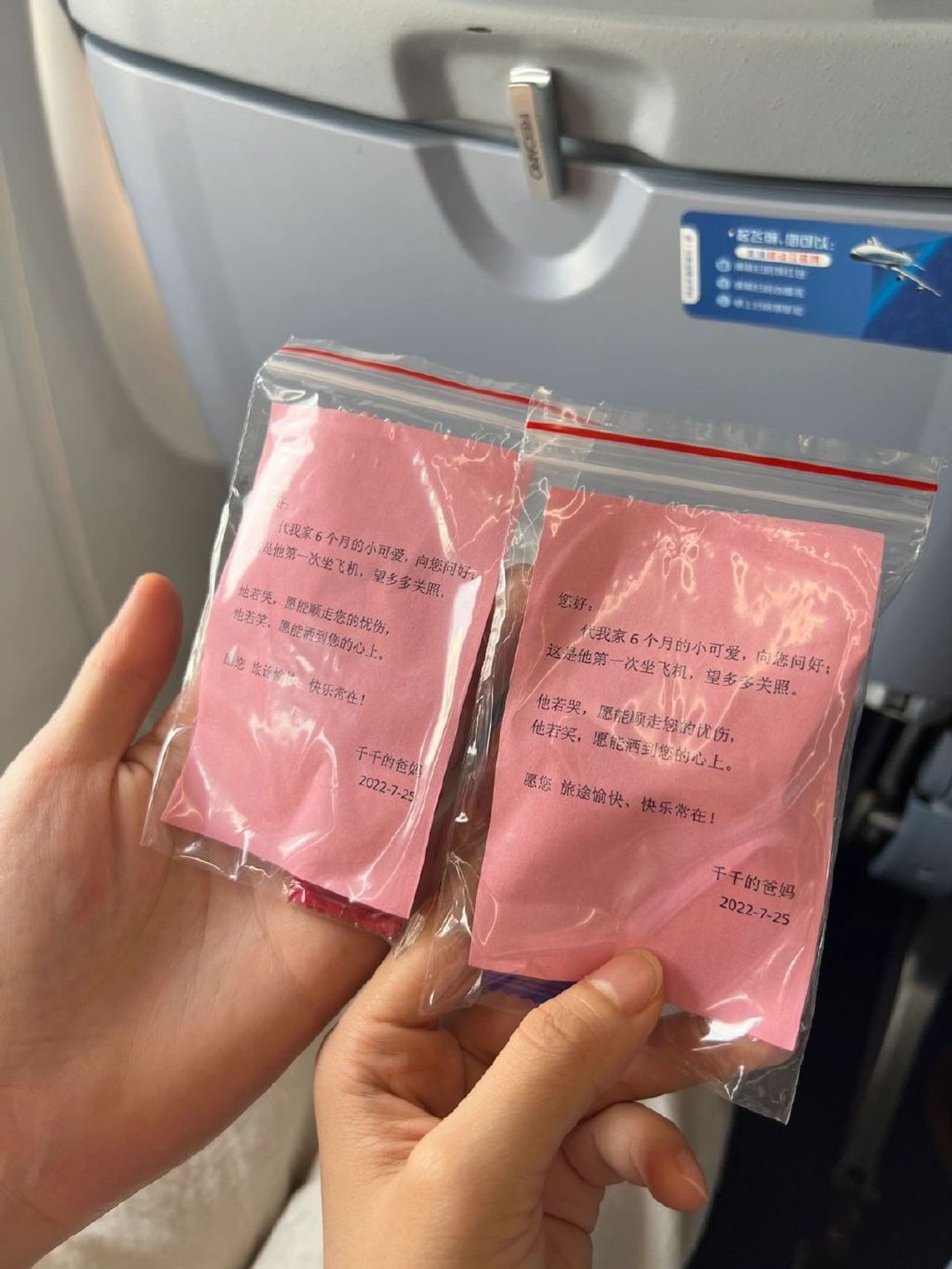 ' _+ ^3 y* S8 `內地有網民在乘坐飛機時,遇到1對父母帶着只有6個月大的嬰兒出遊。因怕孩子會哭鬧影響他人,於是主動向周圍乘客派發裝有耳塞的小禮物。(微博圖片). y; w$ k! A& a! s9 h' i! C