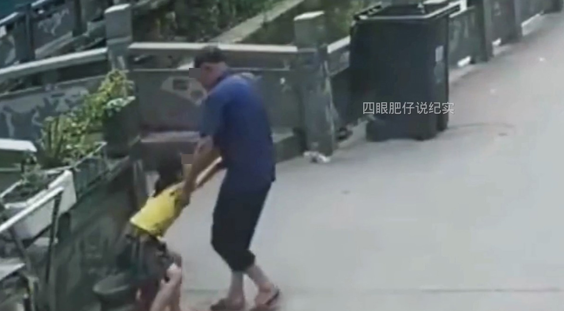 面對小男孩狙擊,男子邊拉着女童邊後退,終被身後垃圾桶綁倒跌在地上,鬆手放開了女童。(影片截圖)