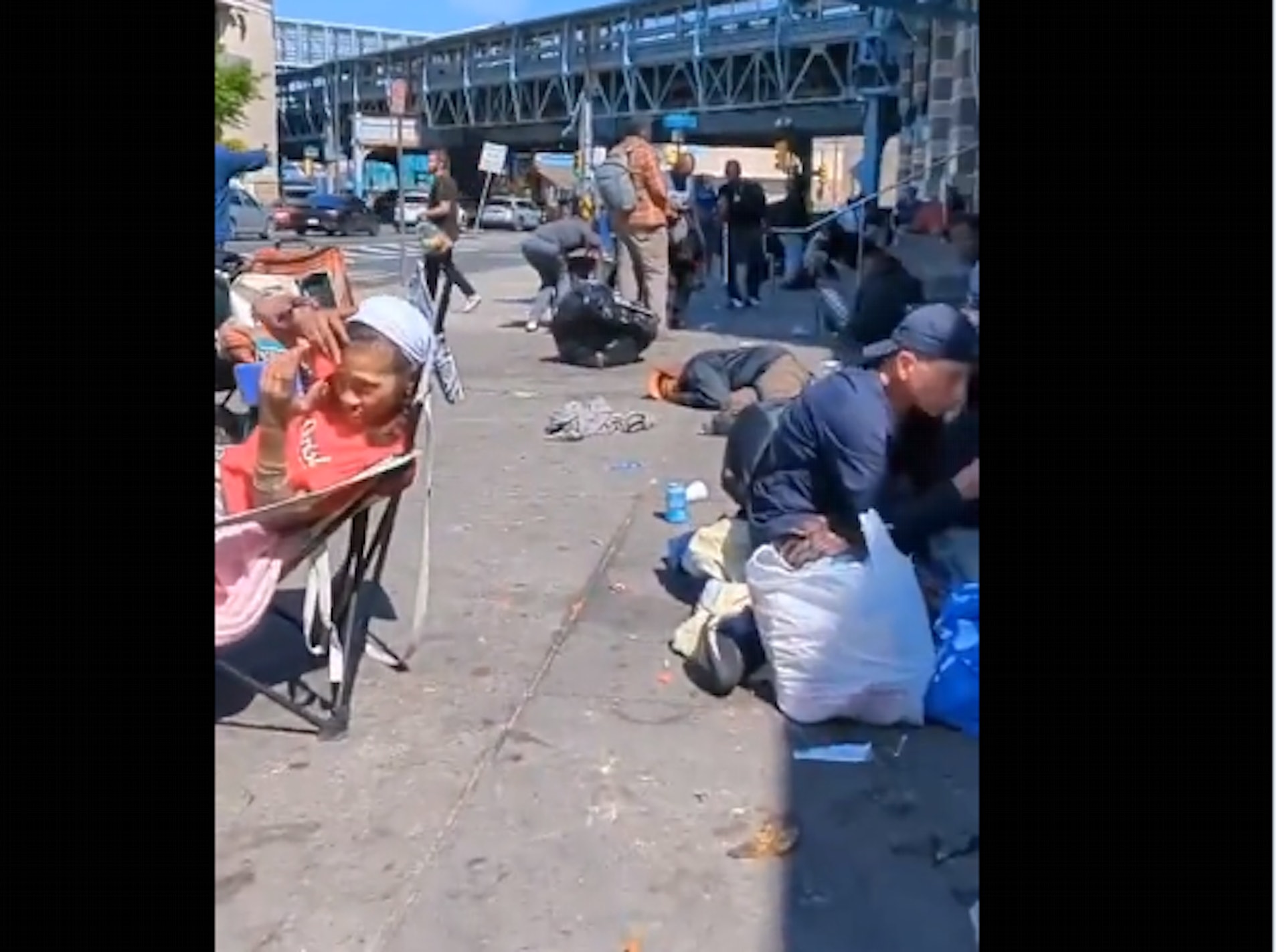 " `9 e2 q; T, `0 f+ P. h) q公仔箱論壇新興毒品、被稱為「喪屍藥」及「鎮靜劑」的「甲苯噻嗪」在美國流傳。圖為2023年5月30日的網上影片截圖,顯示美國費城滿街都是吸毒者。(Twitter影片截圖)