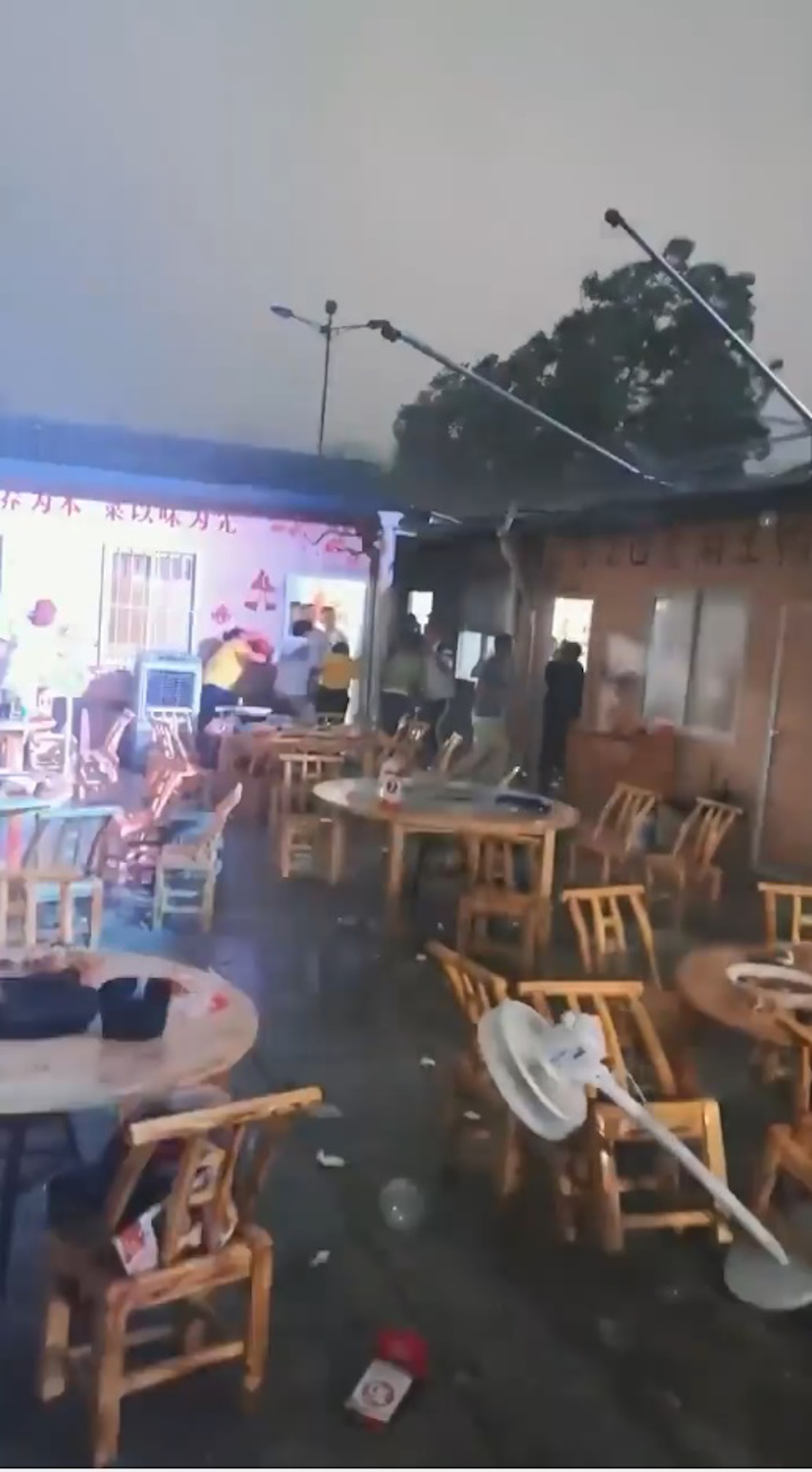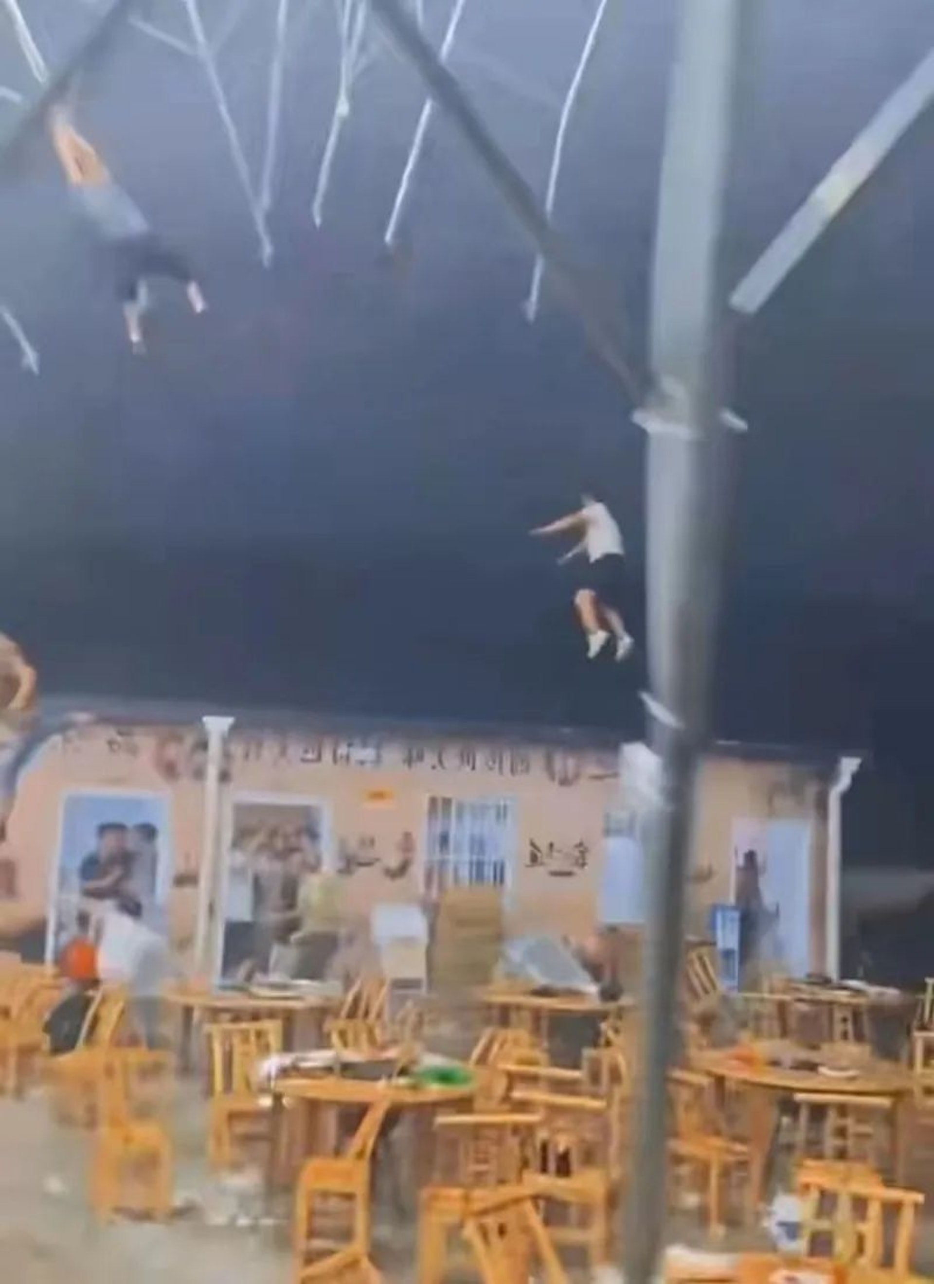 湖北宜昌市昨晚(11日)遭遇暴風雨,有餐廳雨棚被大風掀飛,期間有人拉住支架未及時鬆手,與雨棚一併被風帶至半空再墮下。