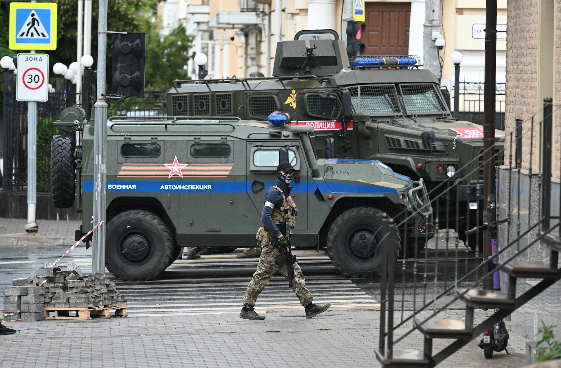 24日7時30分,普里戈任發布講話稱,瓦格納武裝力量已控制羅斯托夫地區包括機場在內的軍用設施。影片顯示,多名持槍人員及坦克包圍當地的內政部大樓。