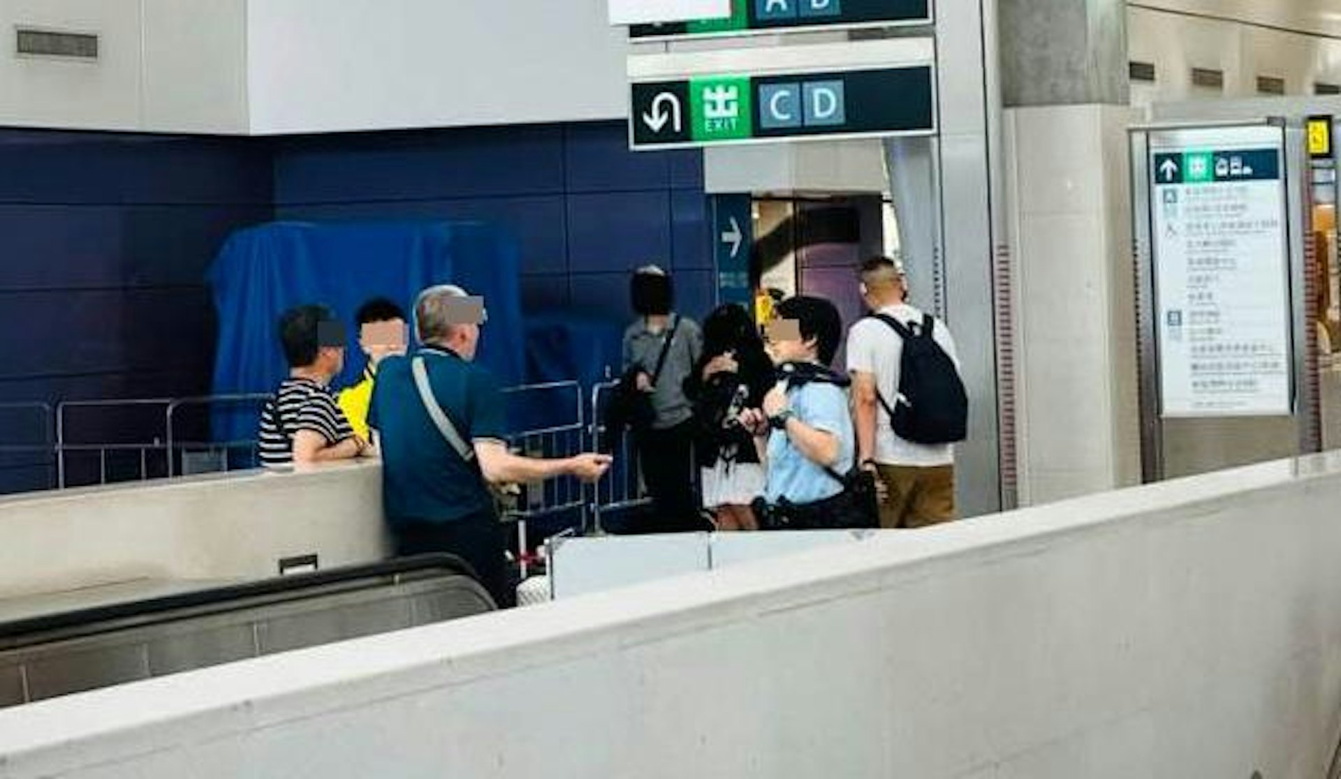 & s8 ]+ e+ F9 k. _& @相片見到,1名老伯及1名老婆婆站在港鐵東涌站往A、B出口扶手電梯旁邊,同場還有1名港鐵職員和1名警員。(Facebook群組「車cam L(香港群組)」)