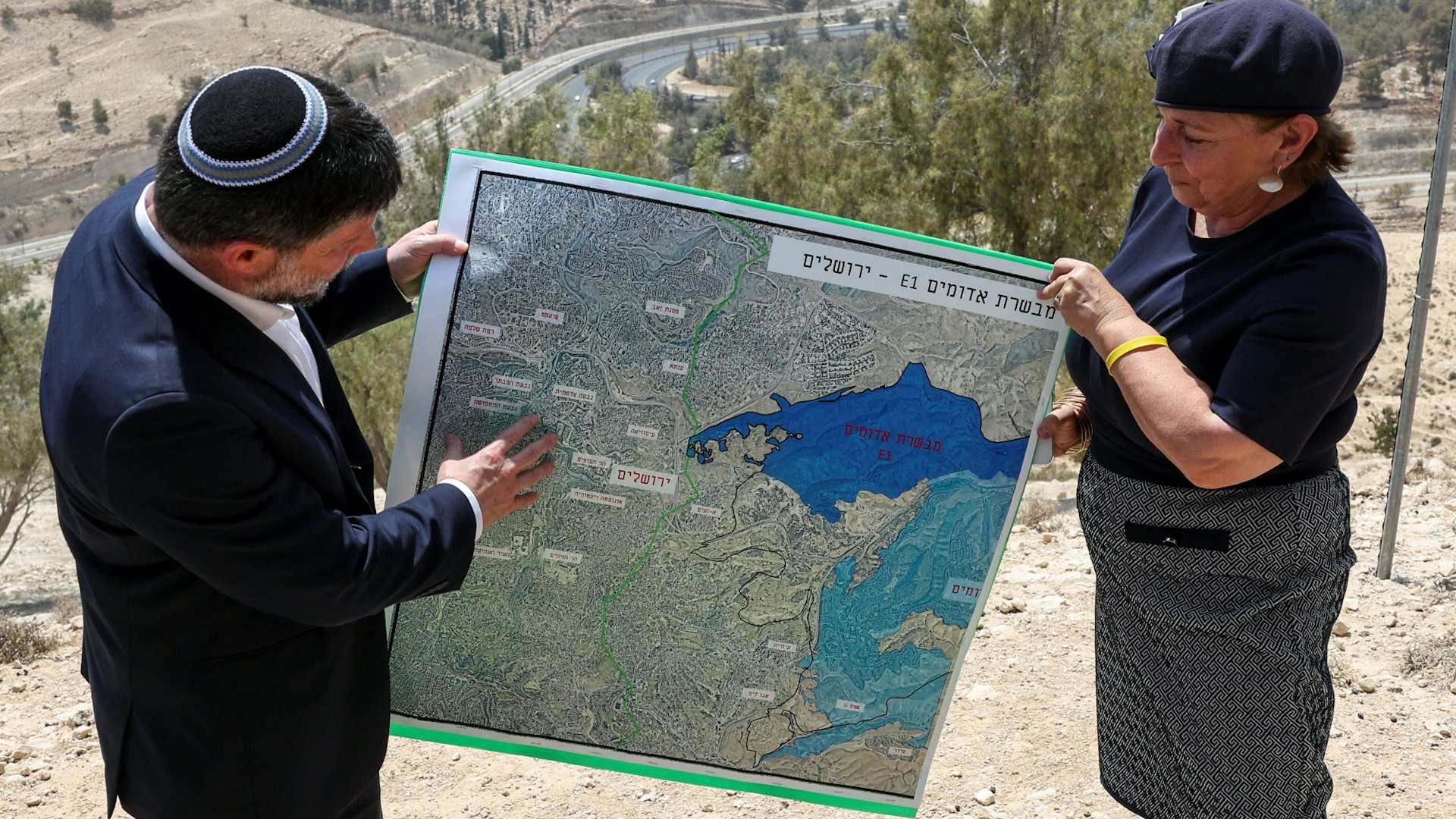 4 _8 K, X+ j% U: |$ I% d5.39.217.762025年8月14日,以色列財政部長斯莫特里奇(Bezalel Smotrich,右)在約旦河西岸定居點馬阿勒阿杜明(Ma'ale Adumim)附近舉行記者會,期間他和一名女子舉着一張與「E1定居點建設計劃」有關的地圖。(Reuters): ~( K0 U7 _- z- Q6 }* r