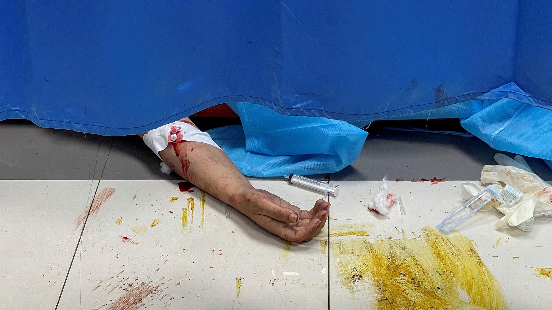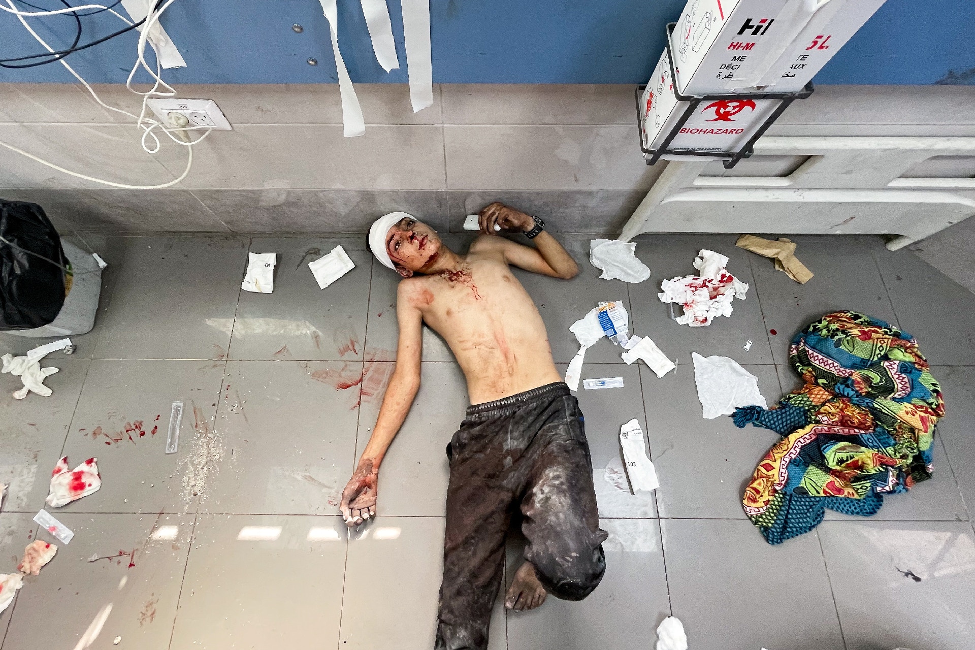 10月17日,加沙市,另一座醫院阿赫利醫院(Al-Ahli Arab Hospital)遭受空襲,數百人死傷,傷者被送到希法醫院急救。以色列和哈馬斯互相指責對方對醫院施襲。(Mohammed Al-Masri/路透社)