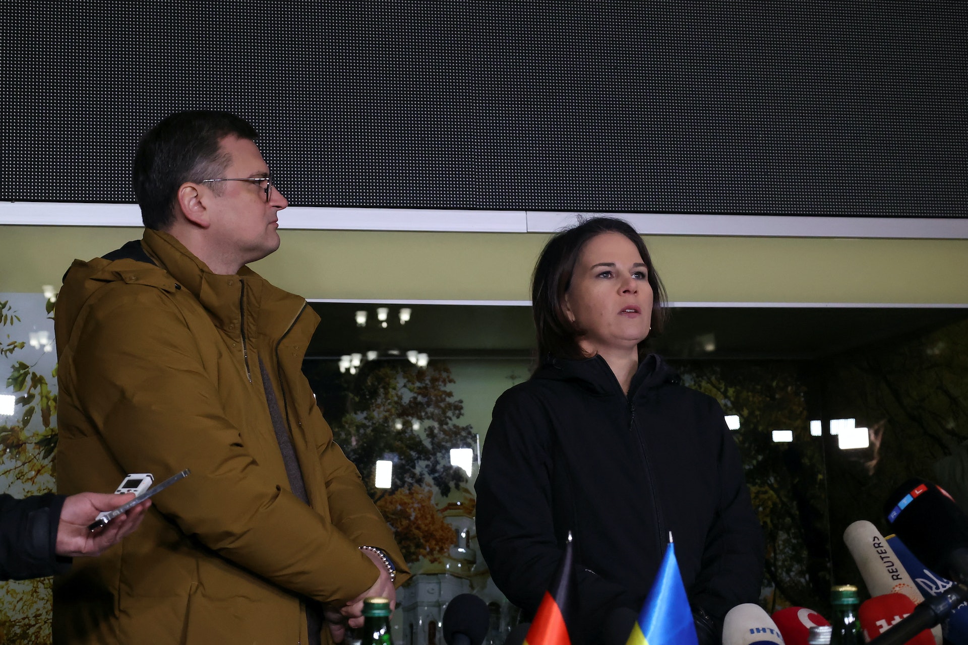 ; b" \, W; @# P德國外長貝爾伯克(右)1月10日訪問哈爾科夫,與烏克蘭外長庫列巴會面。(Reuters).