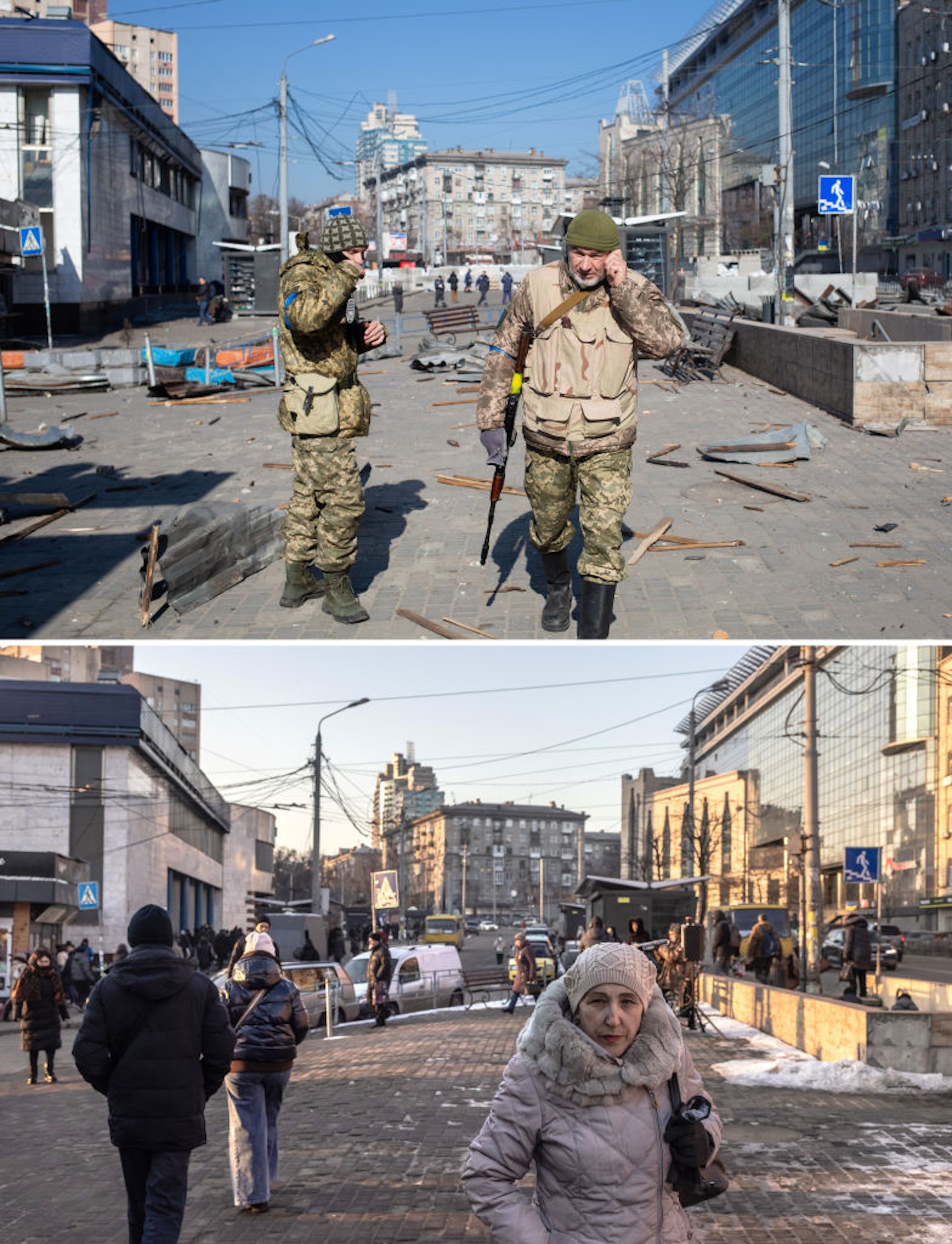 2 @+ f) m" p& k公仔箱論壇烏克蘭首都基輔市內,一年前與一年後的景象對比。上圖為2022年3月15日,烏克蘭軍人在Lukyanivska地鐵站附近被炮擊的建築旁。下圖為2023年2月9日,人們在Lukyanivska地鐵站附近行走。(Getty Images)