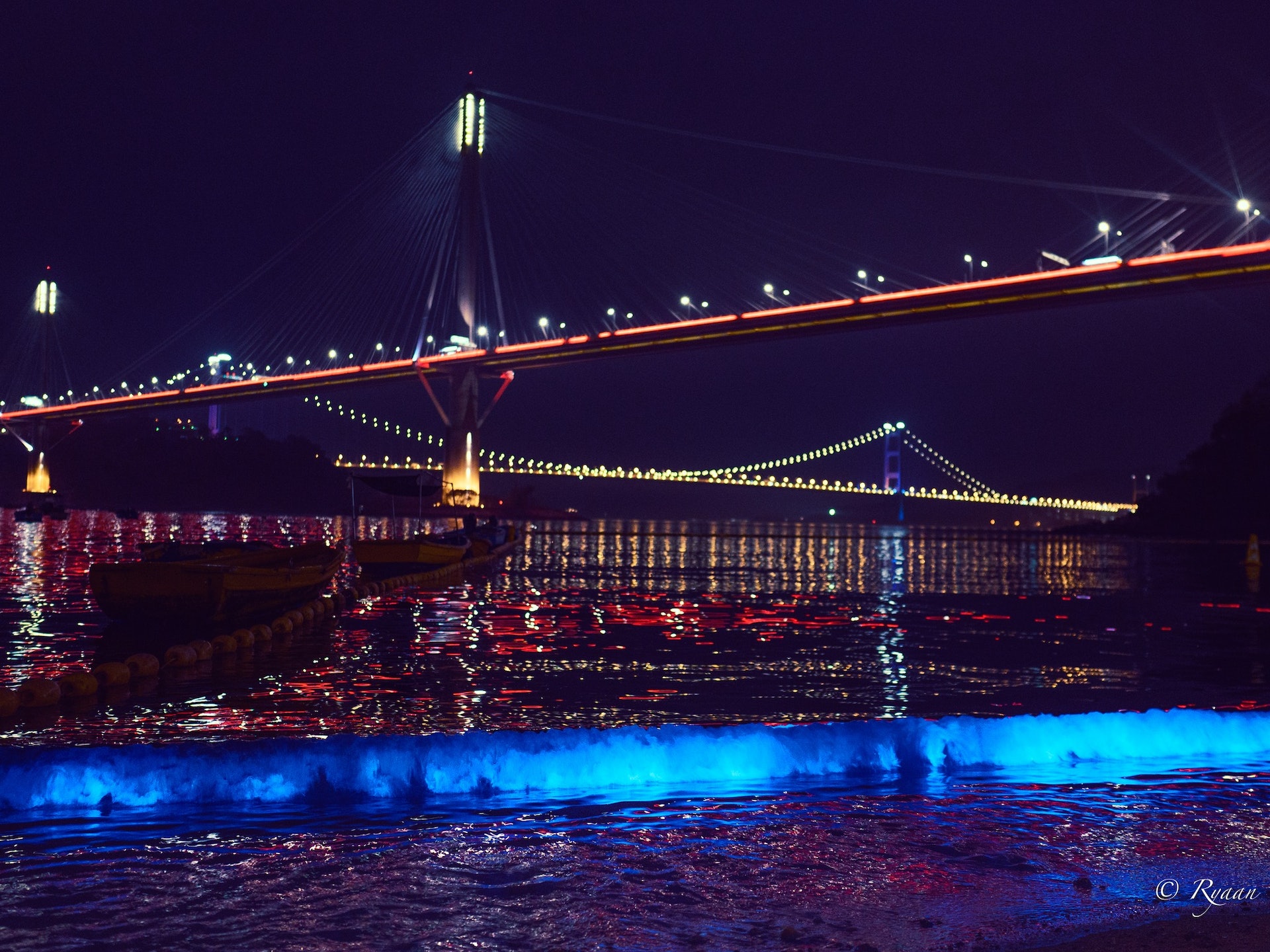3 j+ `0 Q3 i# K6 s近日氣溫又回升,有利「藍眼淚」出現。昨晚(11日)有攝影發燒友前往汀九泳灘,約8時再見到「藍眼淚」縱影,可見藍光在岸邊海浪遍佈,配合背景汀九橋及青馬大橋,形成絕美景色。