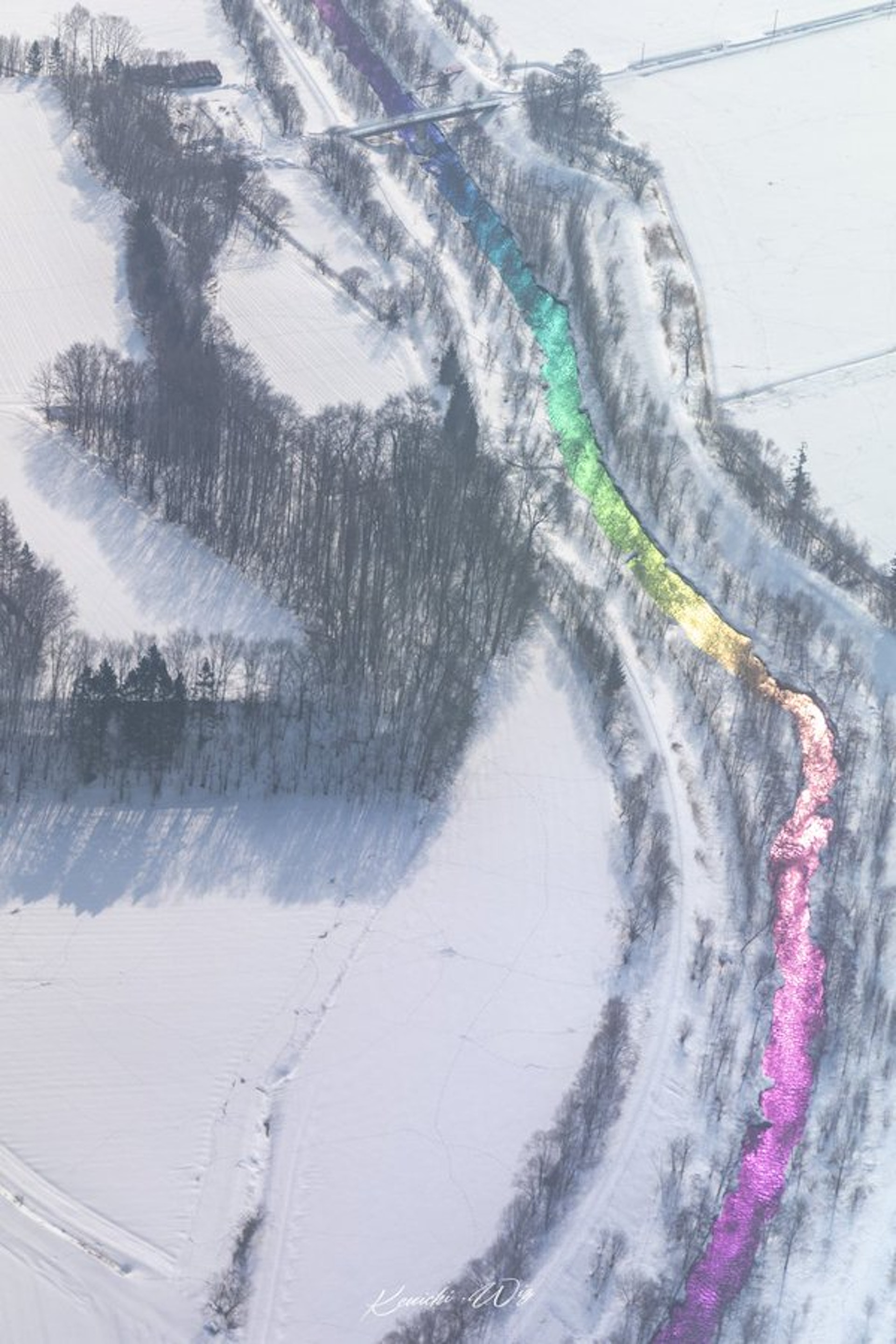 kenichi.wiz表示,這是他在2021年2月14日早上10點左右拍到的畫面。當是他正搭乘飛機,即將在北海道的女滿別機場降落。此時他往外一看,正巧瞬間看到這畫面,並立刻用相機捕捉這一瞬間。他認為應該不是河川本身就五顏六色,而是在各種光學照射,包括特殊的角度,以及飛機窗材質等等影響,才會出現「彩虹河川」的現象。) H! z8 G8 f5 I8 O2 A+ _4 \" O" t: [