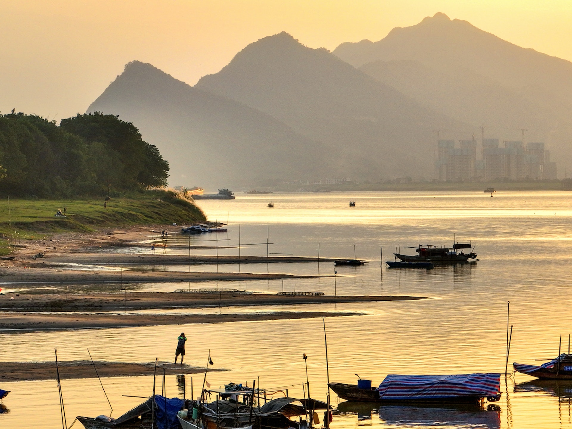 晨光熹微,登高眺望硯洲島,遠峯如黛,還帶著點點夜色。江水深沉而緩慢地流動著,三兩船隻帶著紅色燈火似落葉般隨水而行,硯洲島籠罩在淡淡的江霧中。