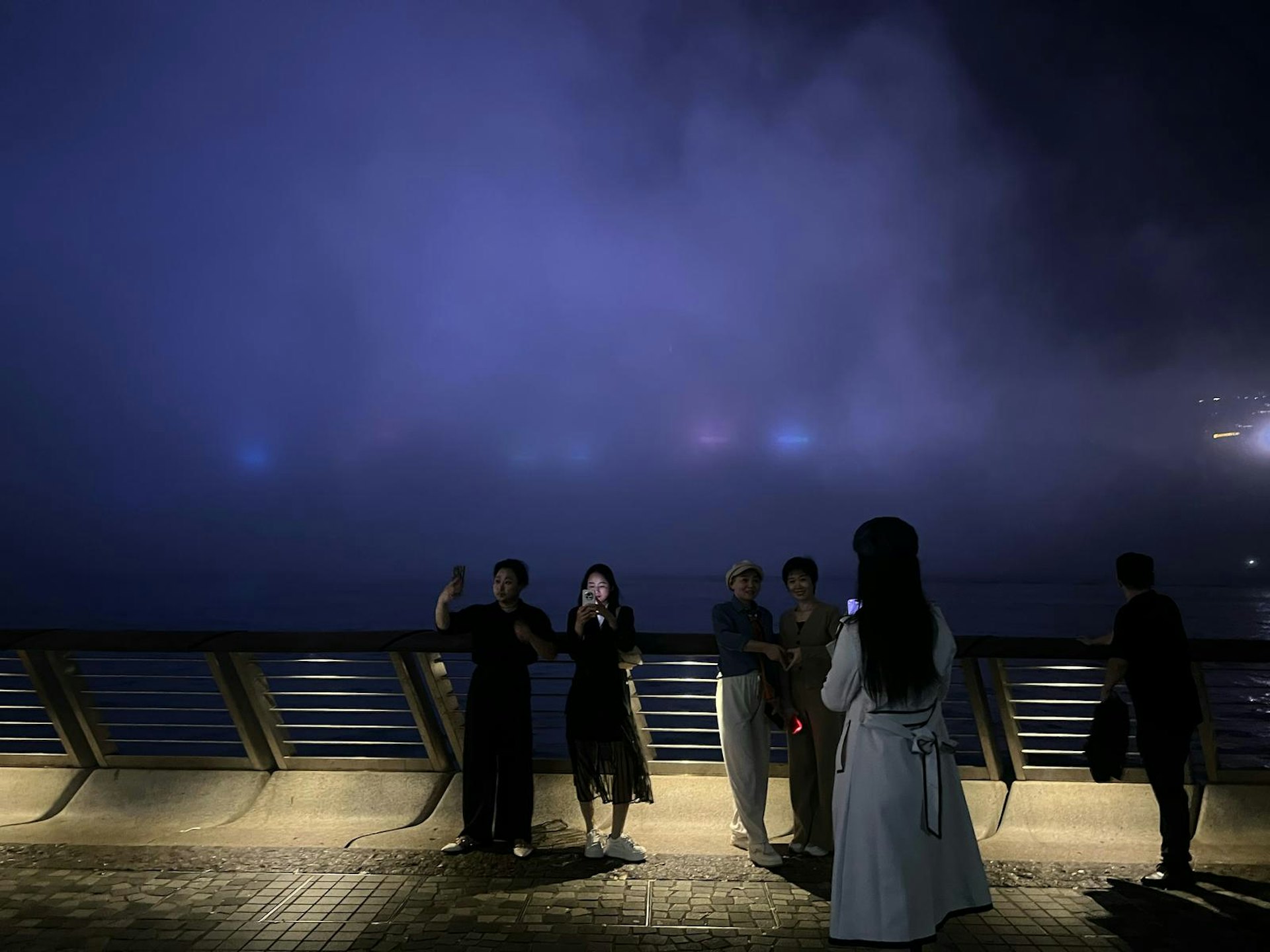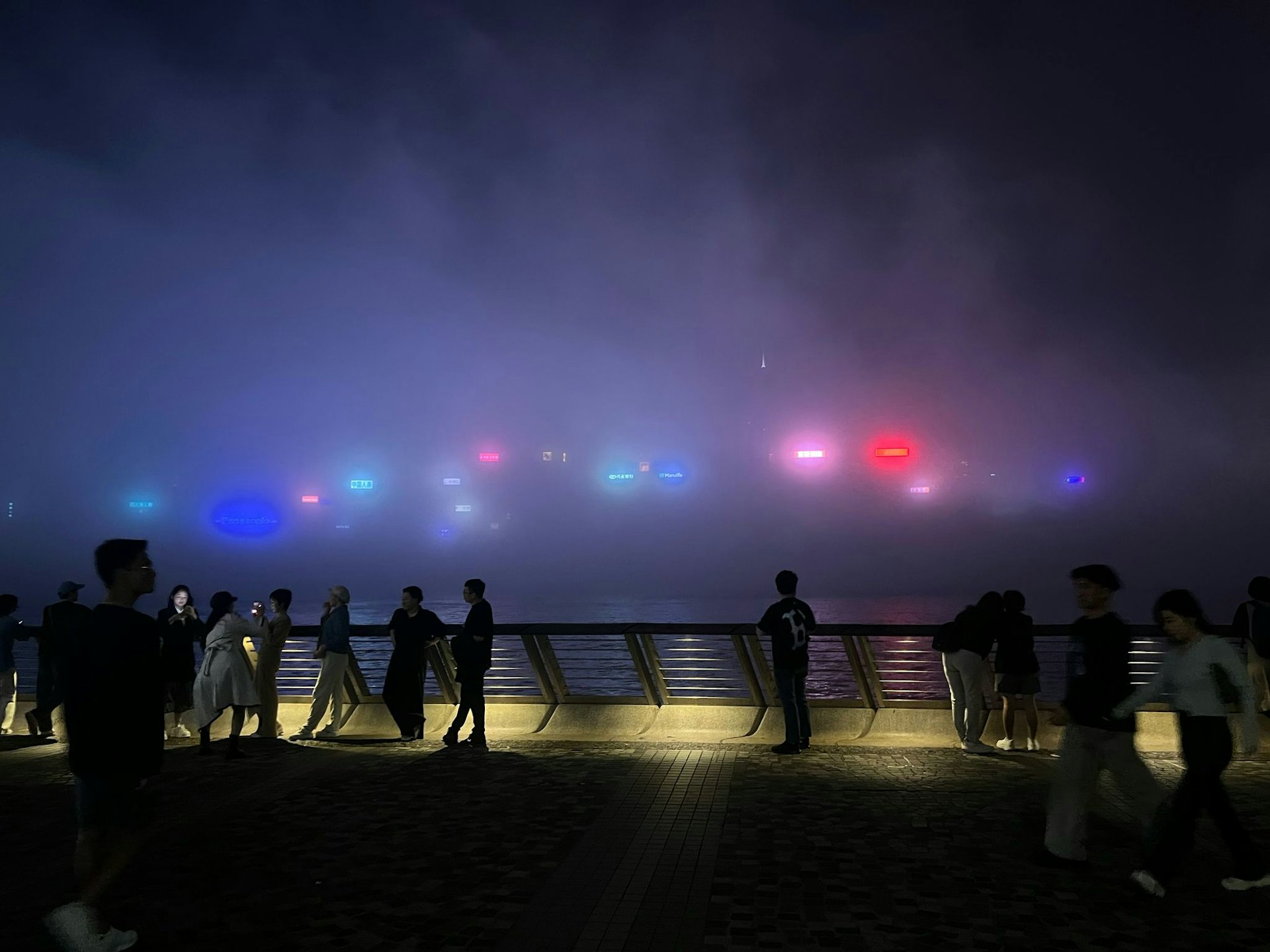 在周日晚上,從尖沙咀海旁望向港島北,一片朦朧,商廈的燈光穿過海霧,散射出五光十色,增添迷離感覺,反吸引市民及遊客打卡影相。