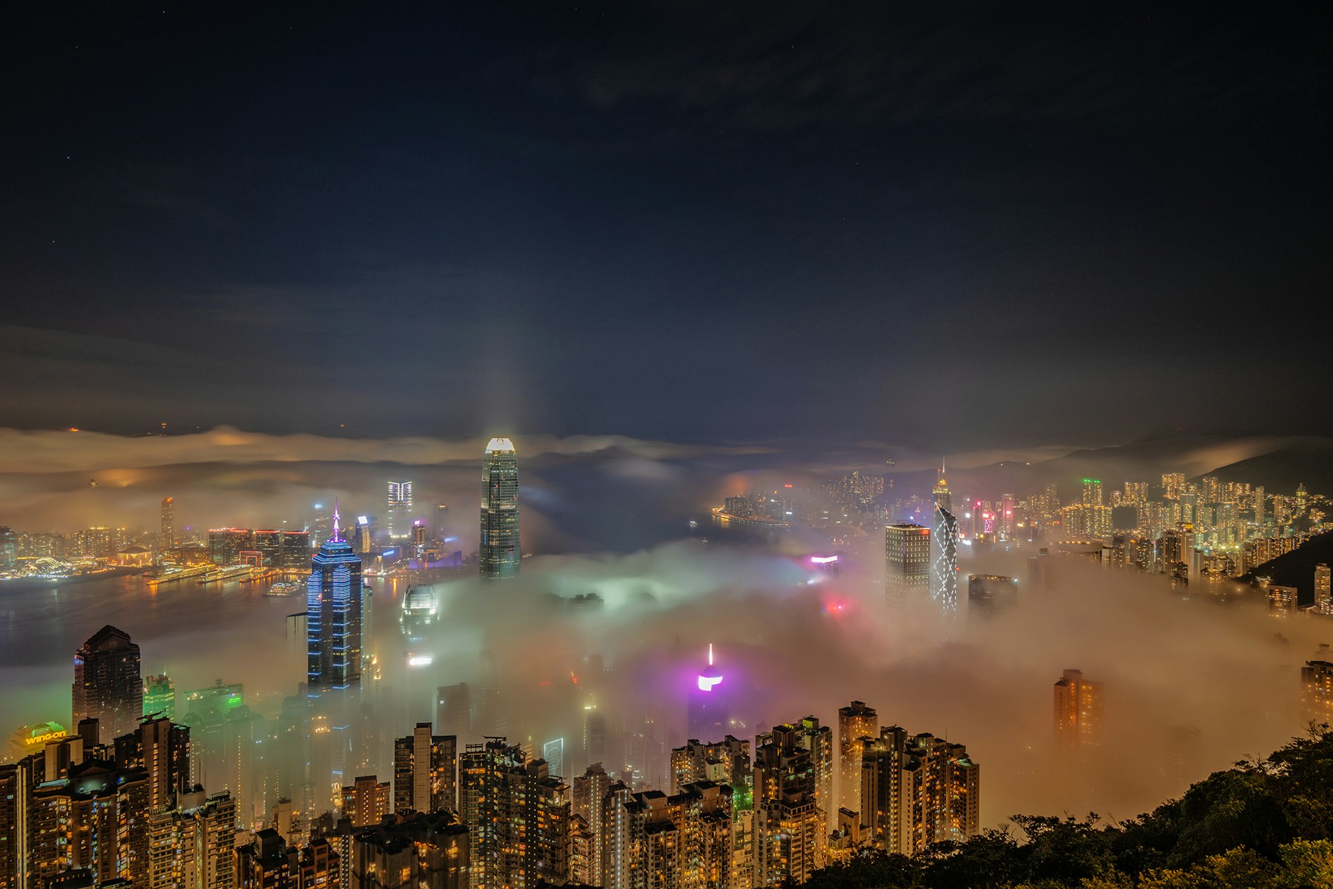 3月2日一場大海霧由下午延續至晚上,有市民走上山頂盧吉道拍攝霧景下的維港上空,五光十色。(Wong Sze Hung攝及提供/Facebook專頁社區天氣觀測計劃 CWOS圖片)