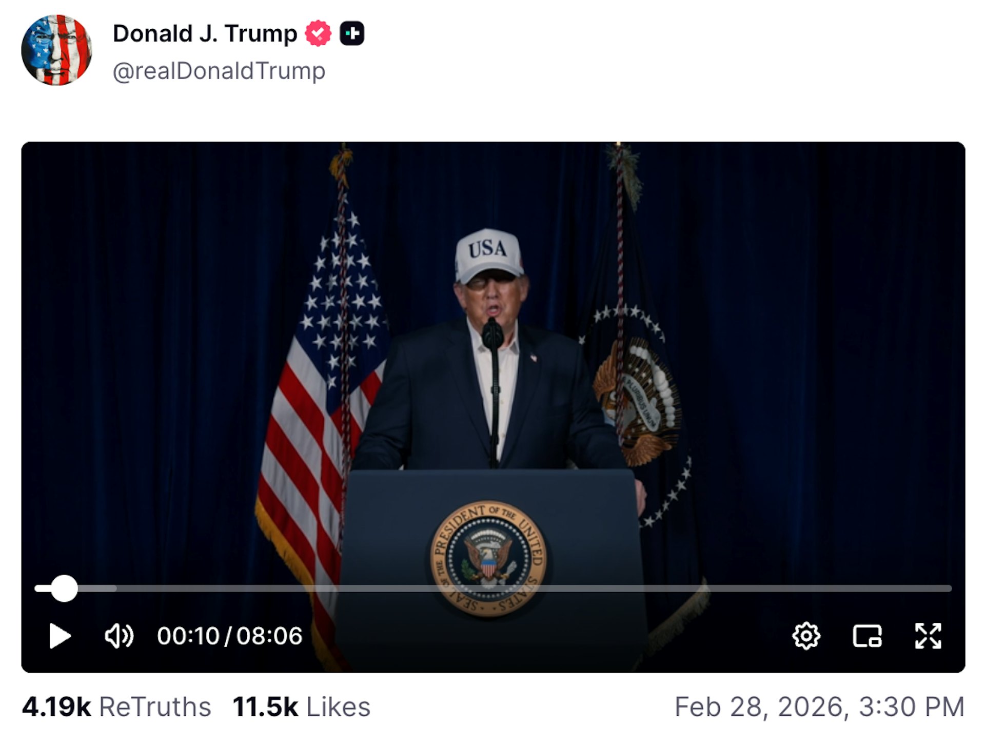 p2 W; M/ Q8 s2 ~2月28日,特朗普在其社交平台Truth Social發布長達8分鐘的演說視頻,向美國人說明轟炸伊朗的目標。(網站截圖)5.39.217.76. {2 _' ^& R% r! H6 \