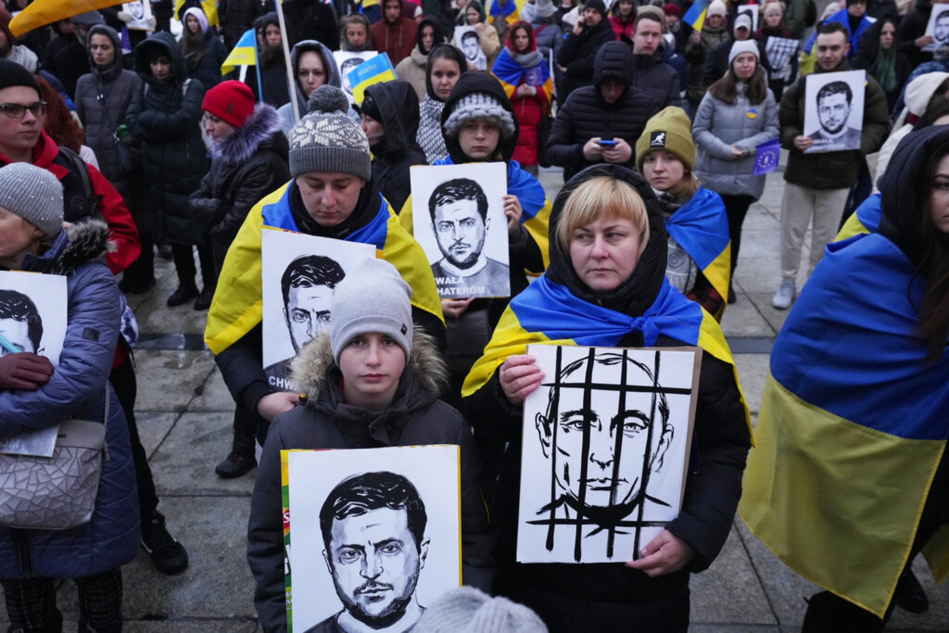 3 Z2 a( @) y) T6 W9 G4月2日,在波蘭華沙舉行的反戰集會上,人們舉著烏克蘭總統澤連斯基和俄羅斯總統普京(被囚禁)的肖像。(AP)tvb now,tvbnow,bttvb b/ x+ _4 r4 Y