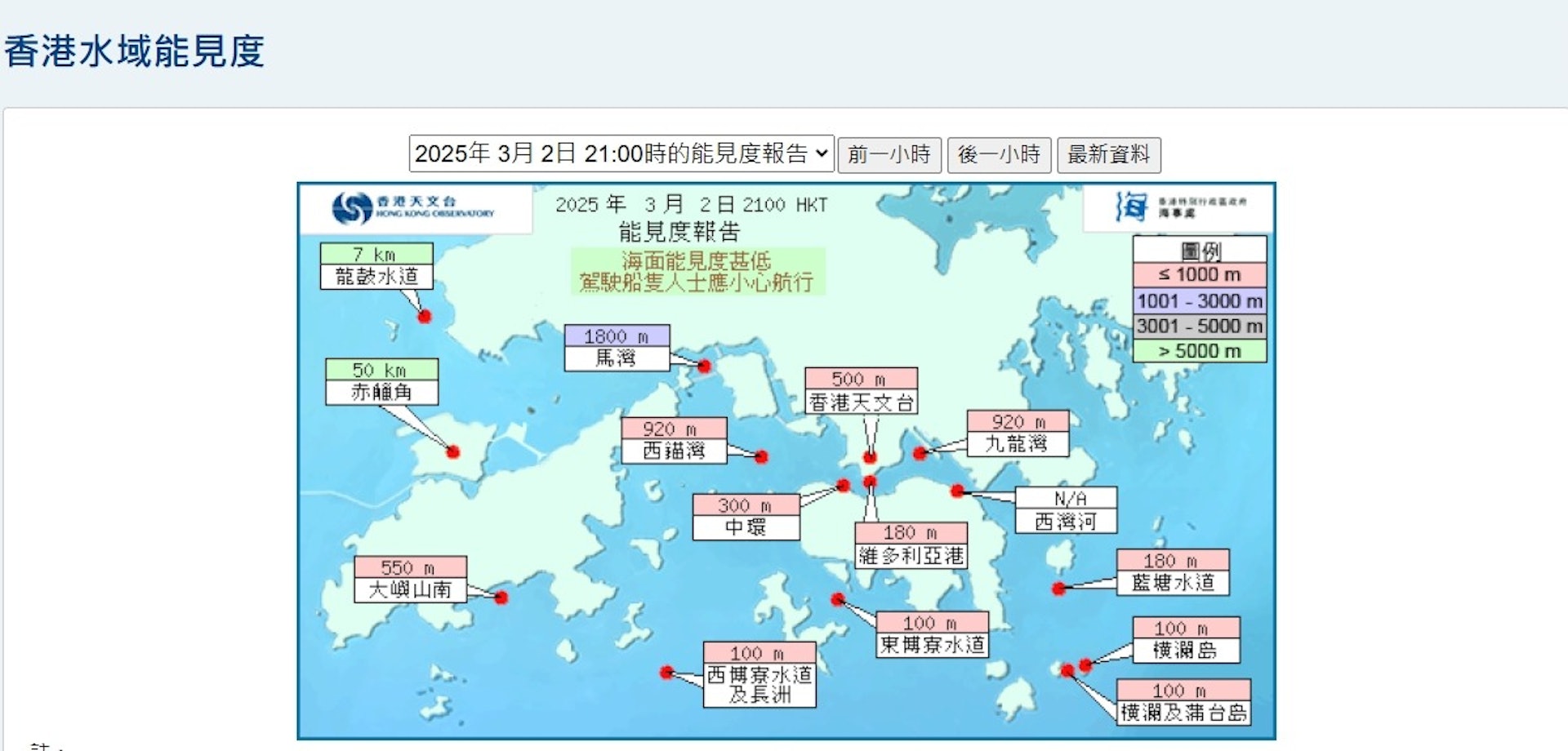 . z+ k/ n) q- b% r! Y3月2日21:00香港水域能見度,天文台降至500米。(天文台圖片)& t( m0 ?1 h2 Z" x1 |