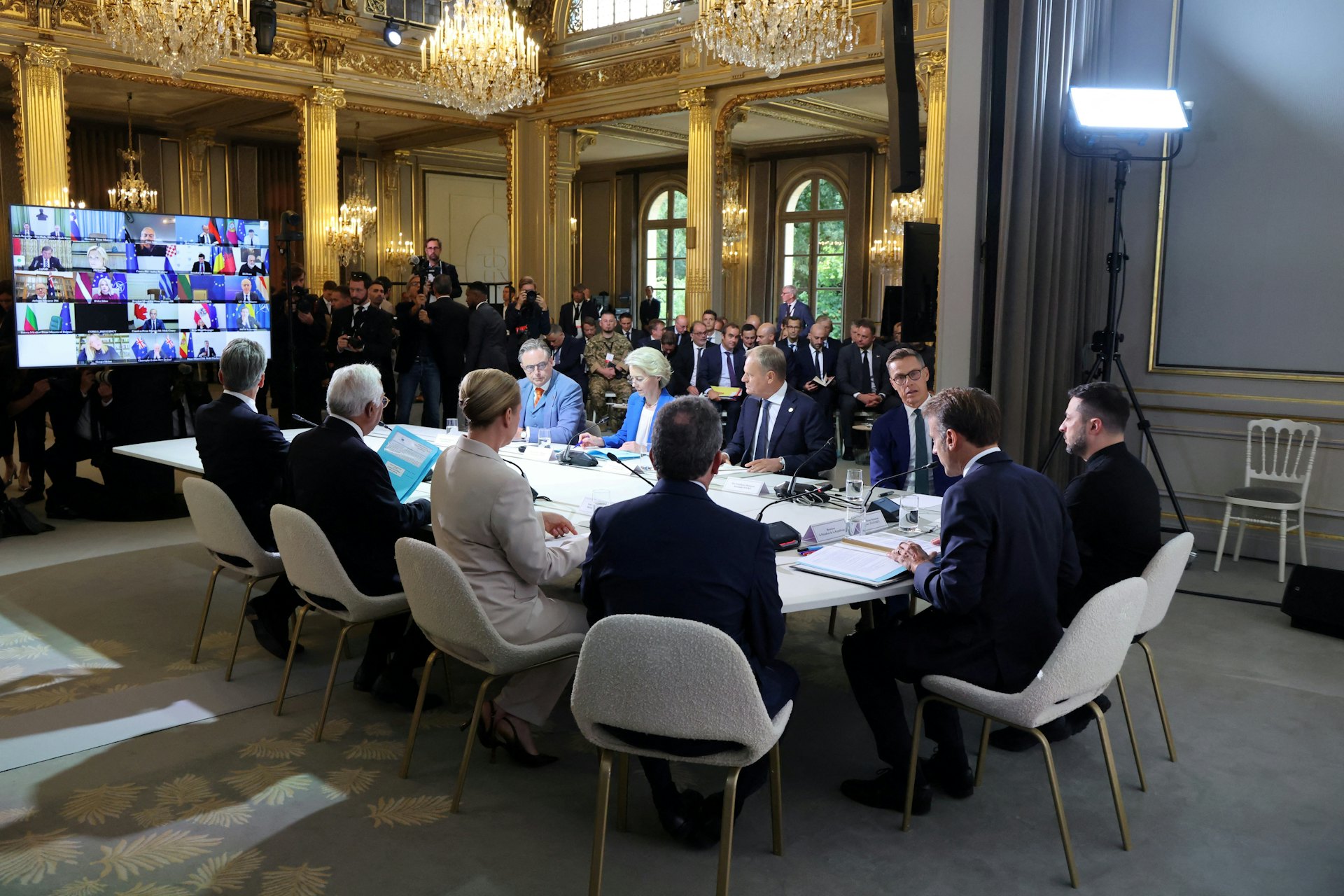 & S9 }4 v1 d. Z# V* y* e法國2025年9月4日主辦「意願聯盟」會議,歐洲各國首腦及美國特使在愛麗榭宮討論對烏克蘭的支持。(Reuters)