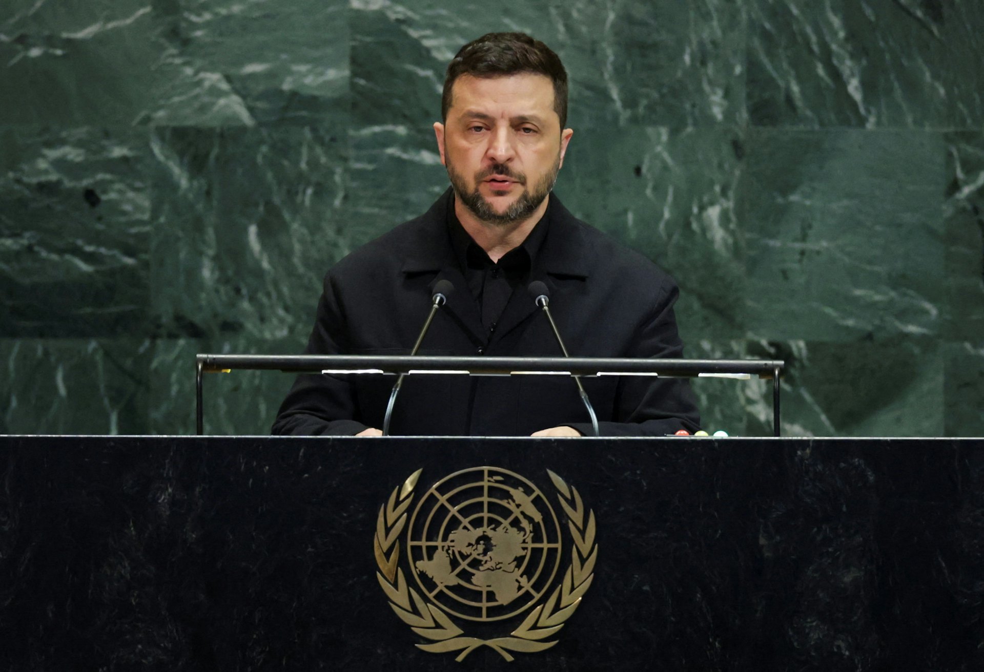 1 |3 ^) V: `! G7 a7 p. g2025年9月24日,美國紐約,烏克蘭總統澤連斯基(Volodymyr Zelenskyy)在聯合國總部出席第80屆聯合國大會 (United Nations General Assembly,UNGA) 並發表演說。(Reuters)