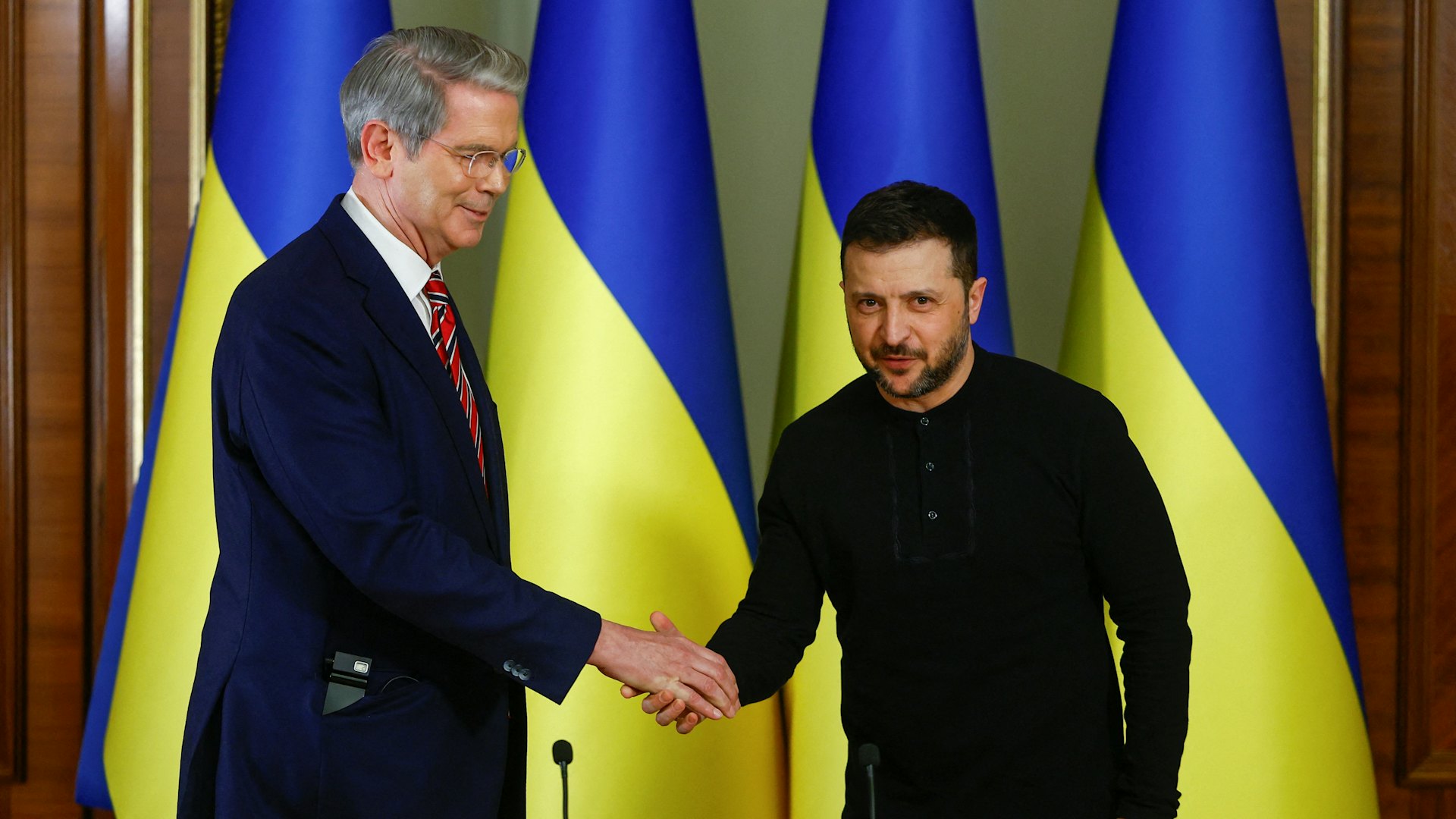 # ^' A) z8 W; c: X2025年2月12日,烏克蘭總統澤連斯基(Volodymyr Zelenskyy)和美國財政部長貝森特(Scott Bessent)在基輔舉行聯合新聞發布會後握手。(Reuters)tvb now,tvbnow,bttvb8 ]2 l/ M& Y7 t7 U! \4 e$ z