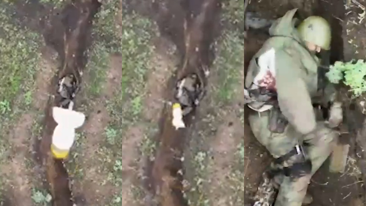 近期,推特流傳一段俄羅斯士兵躲在戰壕裡,2次徒手接住烏克蘭無人機投下的榴彈,最後沿著壕溝成功逃亡的影片。(Twitter@TpyxaNews)