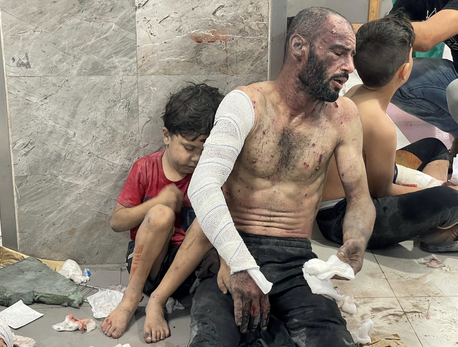 6 }& ^+ [" u" F( z# G) k J3 r公仔箱論壇以巴衝突:2023年10月23日,一名在以色列襲擊中受傷的巴勒斯坦男子和他的兒子,坐在加沙城希法醫院的地板上。(Reuters)5.39.217.76 M. A: G7 H) w7 [