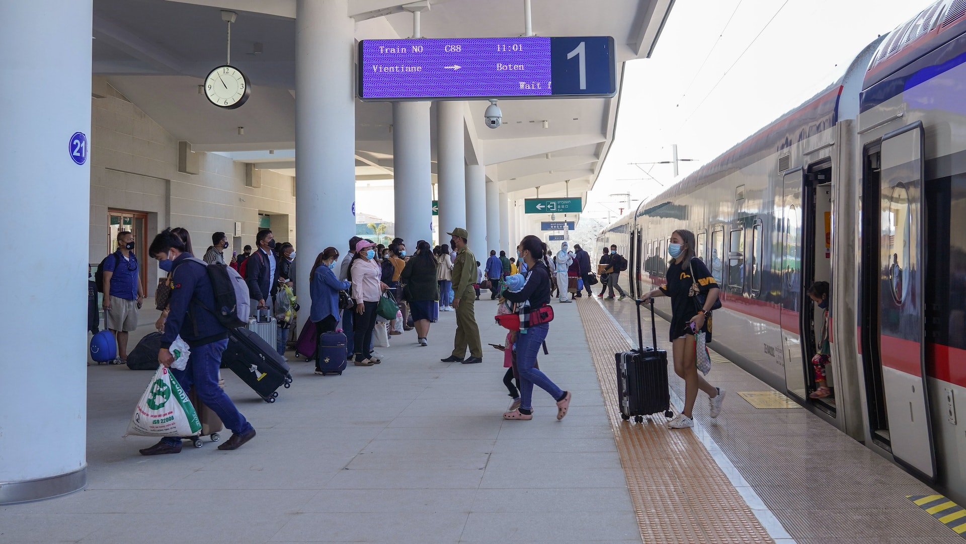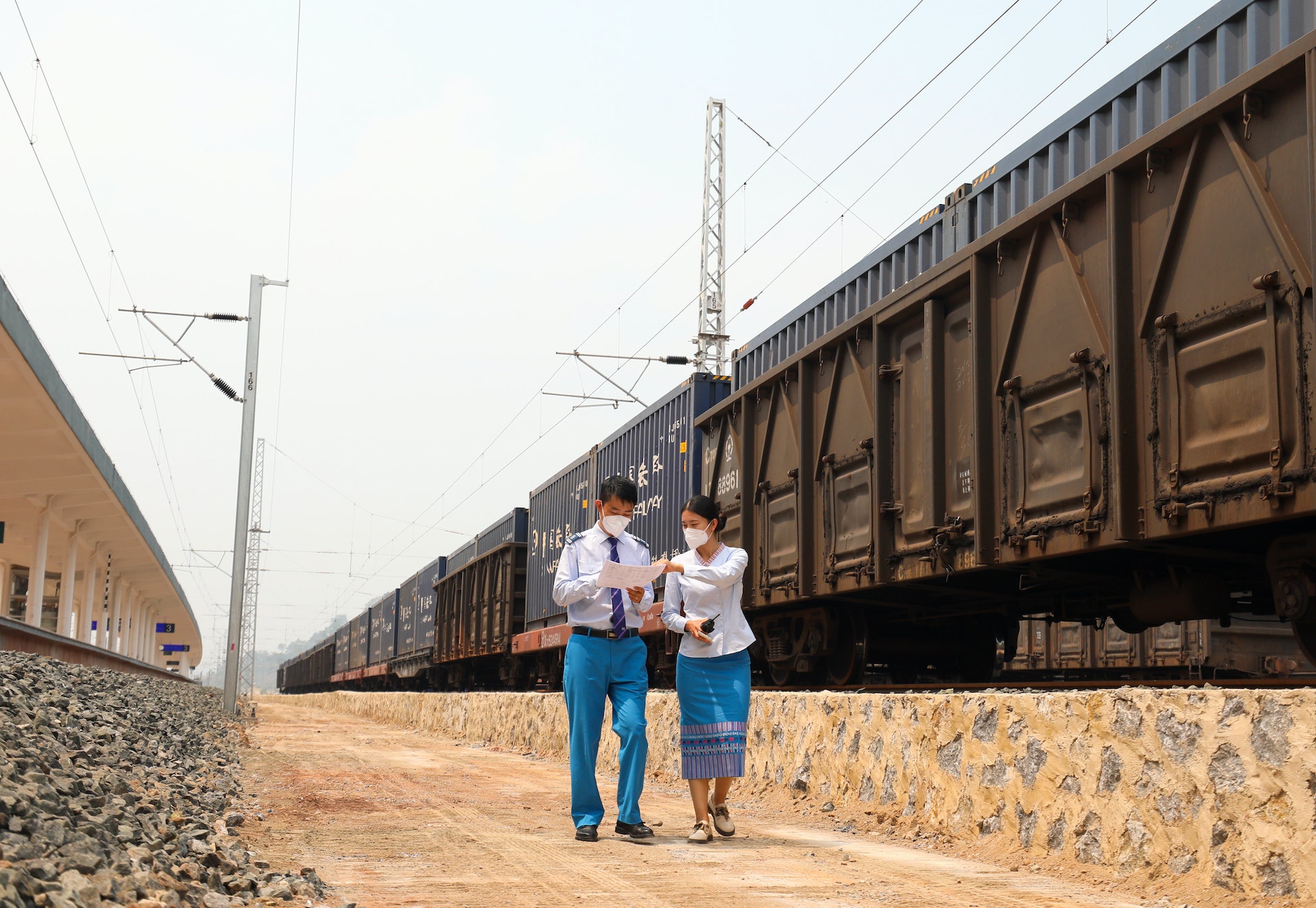 ' B/ E. z* ~" b中老鐵路開通已逾一年,已成為連結中國與東盟各國的陸上「黃金通道」。(新華社)