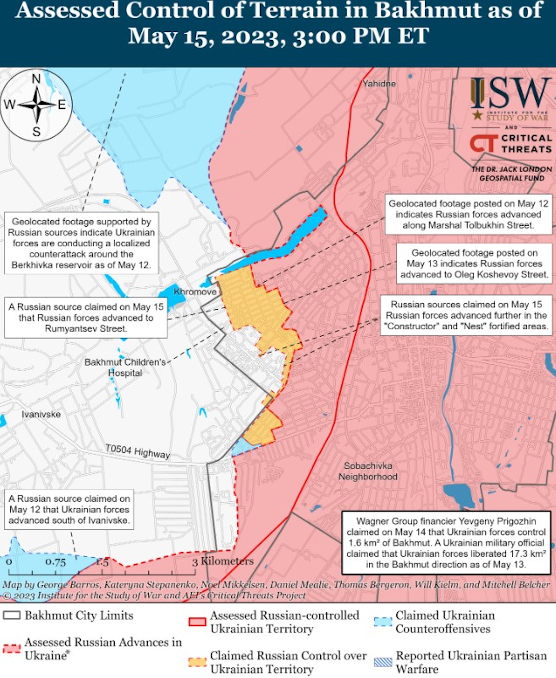 . i! f$ z# f% p( F公仔箱論壇巴赫穆特至5月15日的形勢。圖中為巴赫穆特城區,圖左上、下方的淺藍色部分原來是俄軍南北包圍烏軍的兩翼,目前已被烏軍局部奪回。(ISW)