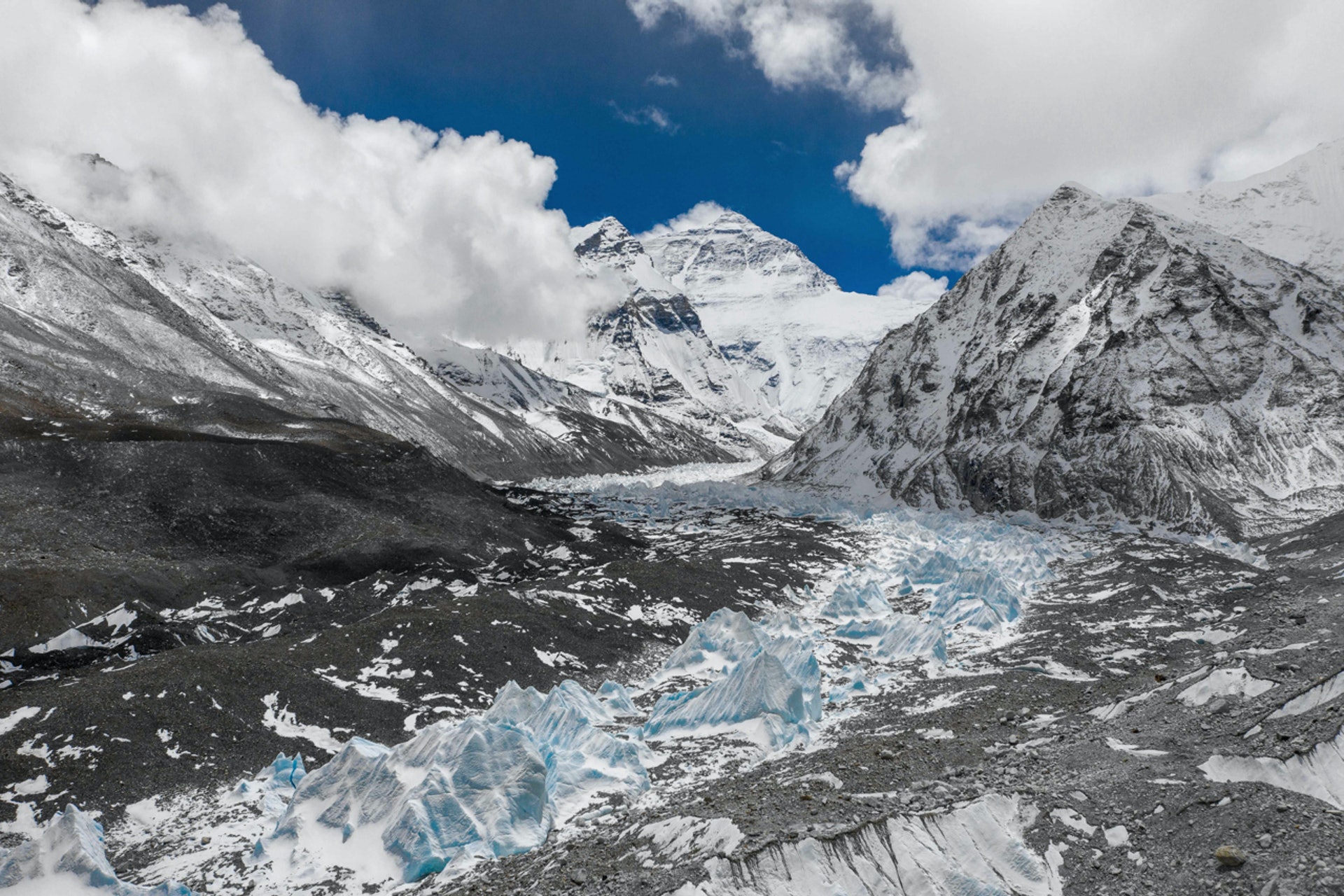 ) A/ H5 o, F+ w" D! N z航拍無人機拍攝喜馬拉雅山脈的絨布冰川。圖片攝於2020年5月3日。(旦增尼瑪曲珠/新華社)